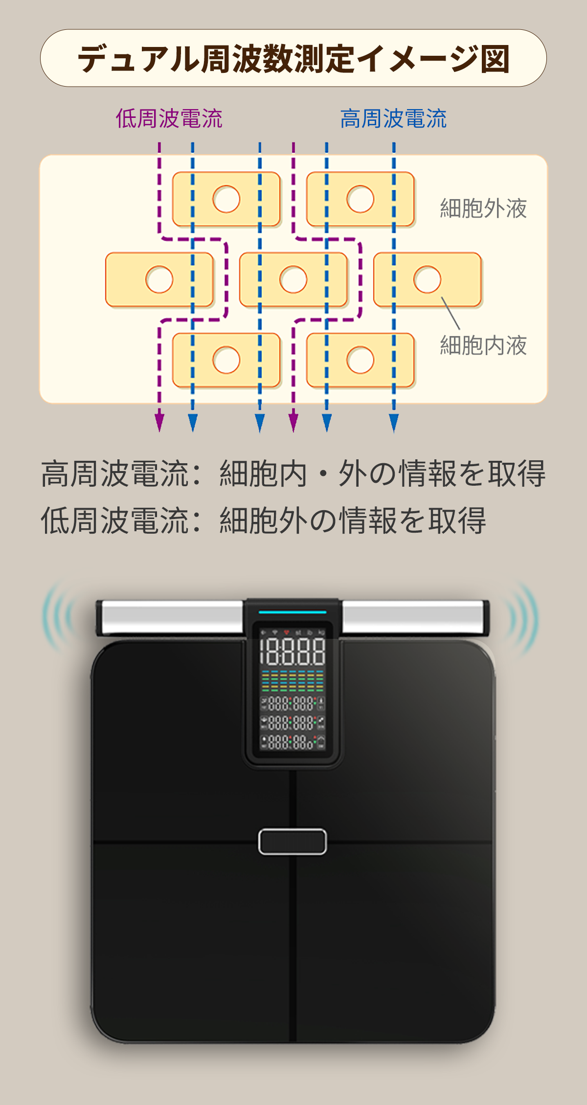 2種類の周波数を使い分けることで、細胞外液と細胞内液を分別測定。一般的な家庭用体組成計では計測不可能な、深部のデータまで把握できます。