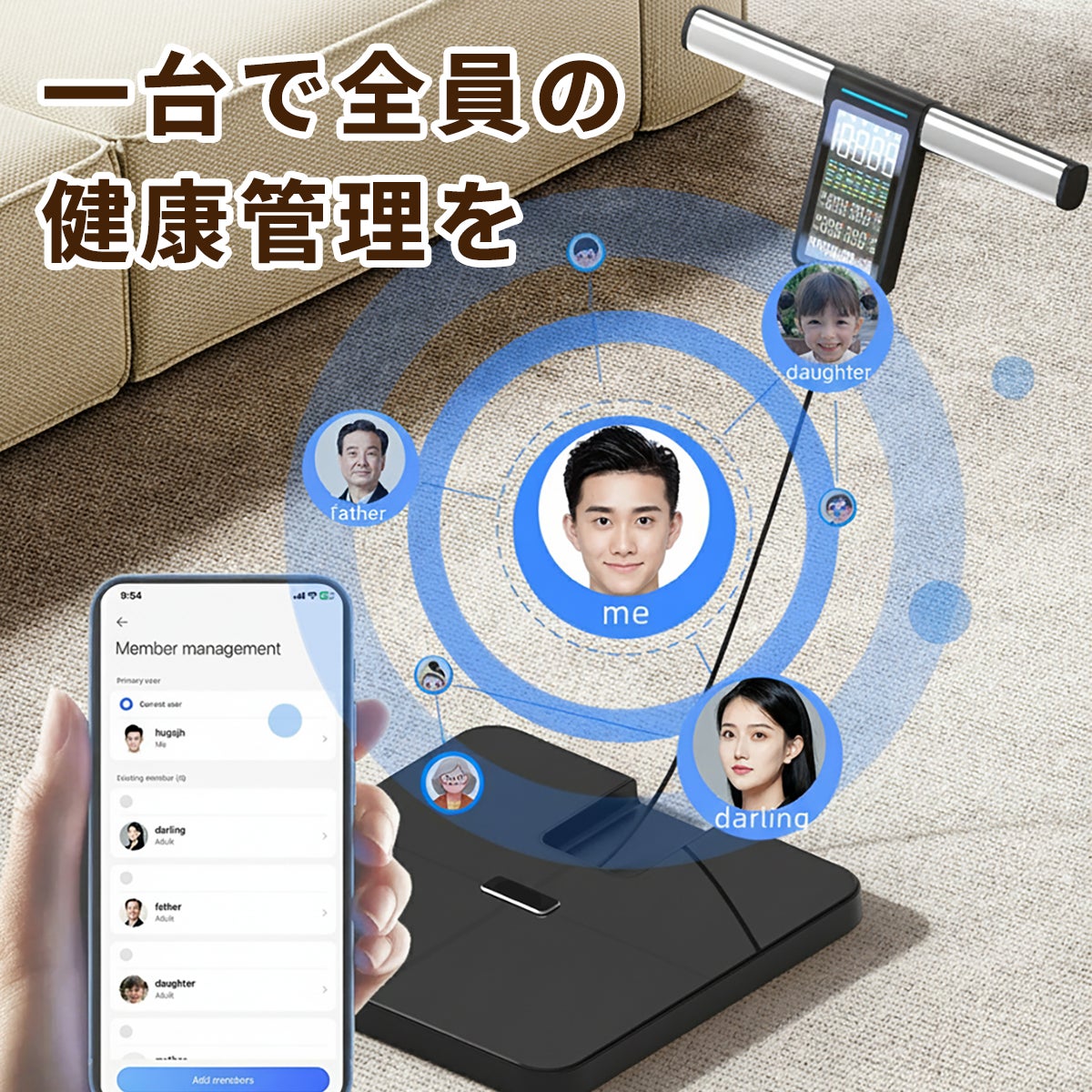 家庭での家族共用はもちろん、ジムやクリニックでの利用も想定した設計。WELSY はさまざまなシーンで使用できます。最大 200 人のユーザーに対応します。10 人分の最近のプロファイルをローカルに保存することができ、後でアプリで取得することができます。