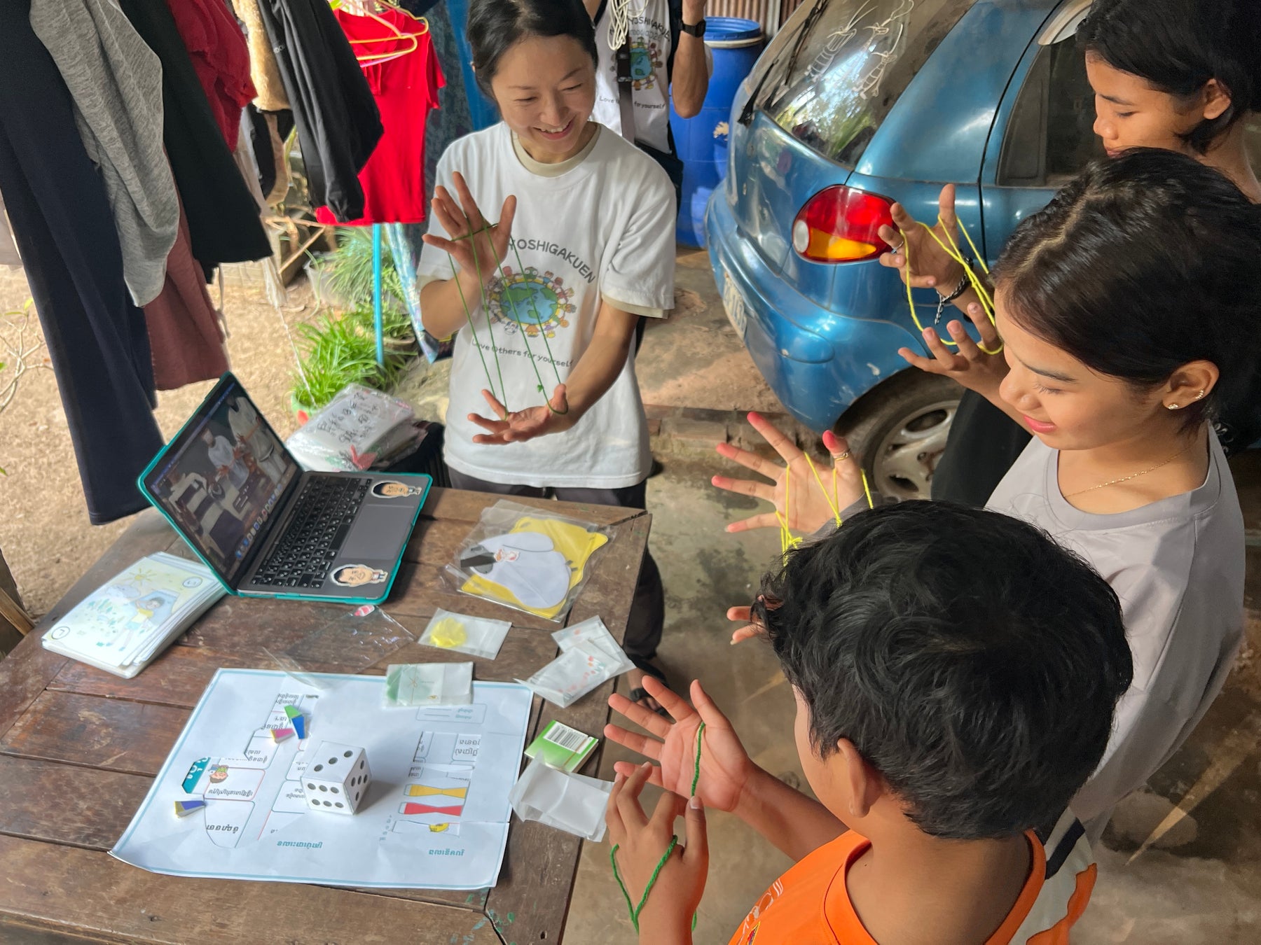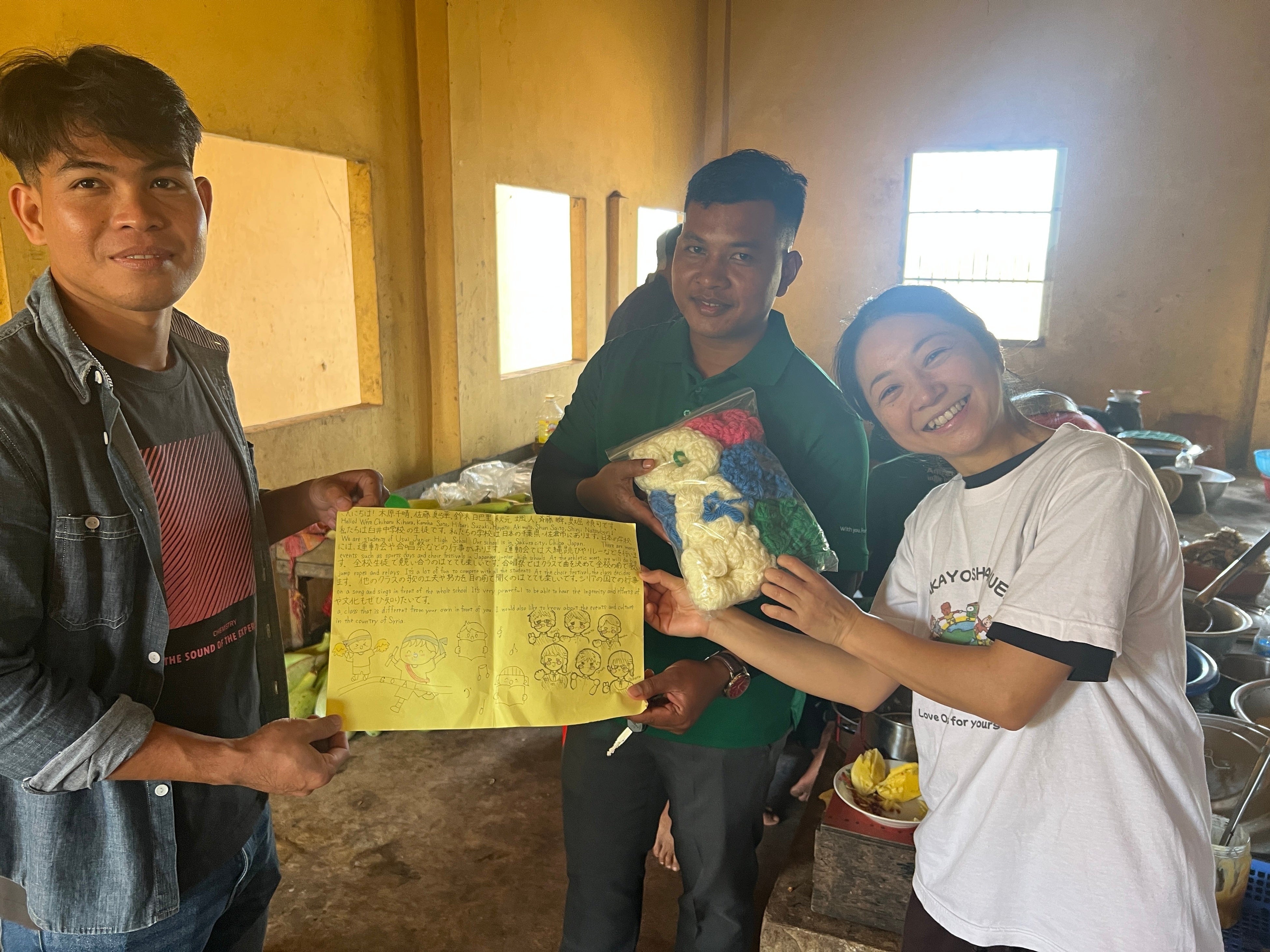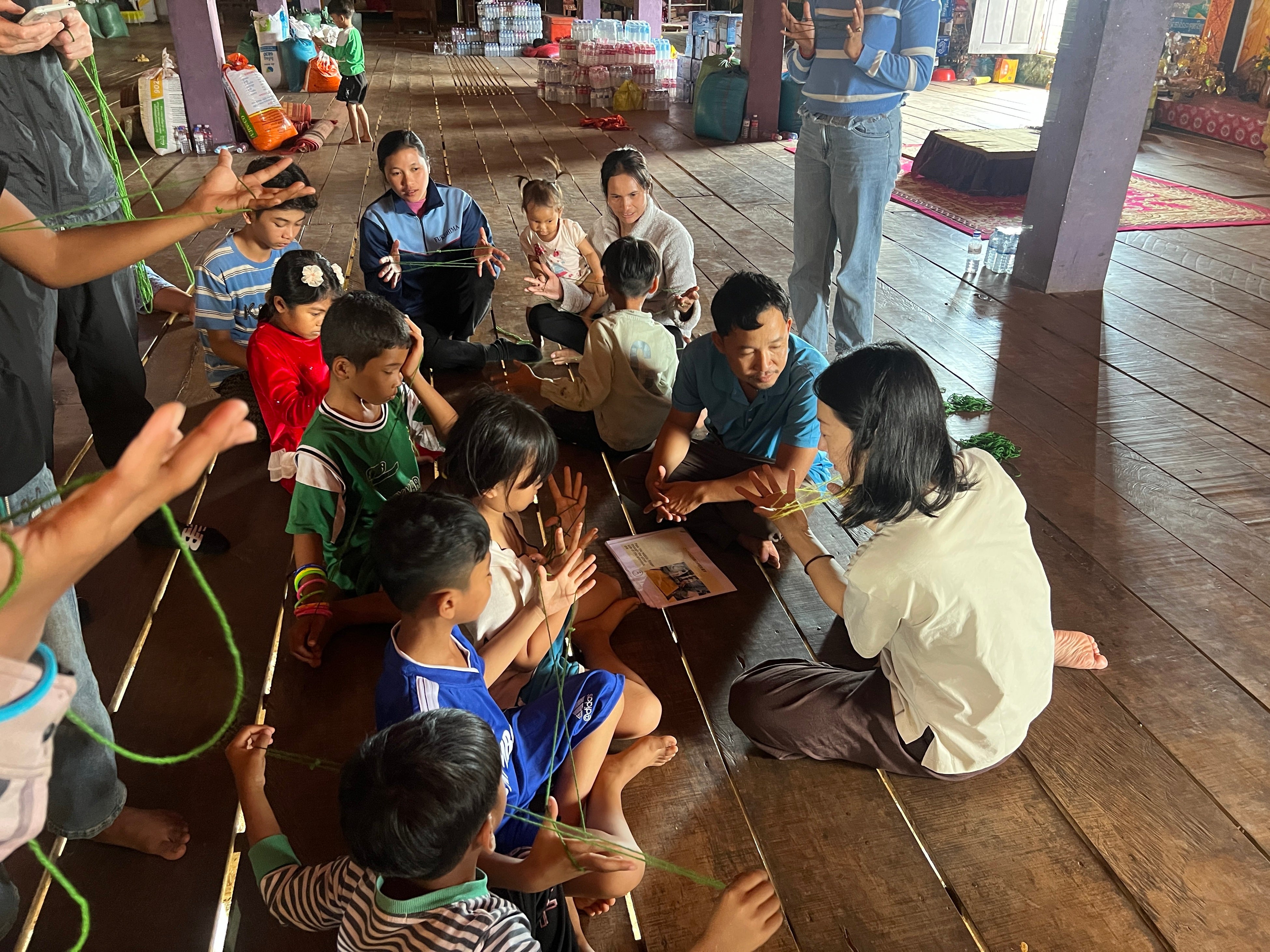 2025年12月29日、カンボジア王国シェムリアップ州Chi Kraeng(チークレン)の避難民収容寺院にて実施した緊急支援(教育支援・炊き出し)では、佐倉市立王子台小学校の「あやとり」および佐倉市立臼井中学校の「アクリルたわし」が現地で活用されました。