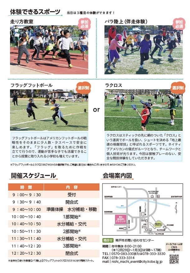 走り方教室、パラ陸上(伴走)、フラッグフットボール、ラクロスの体験会を神戸市西区役所と共催