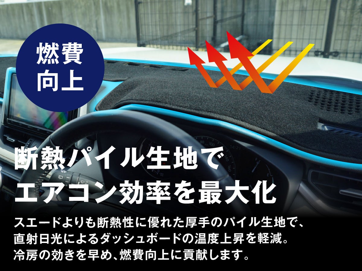 厚手のパイル生地が直射日光によるダッシュボードの表面温度上昇を抑制します。これによりエアコンの効率を高め、車内空間の快適性を向上。また、スエード素材に比べて指跡やホコリが目立ちにくいため、美しく整った大人の車内空間を維持できます。