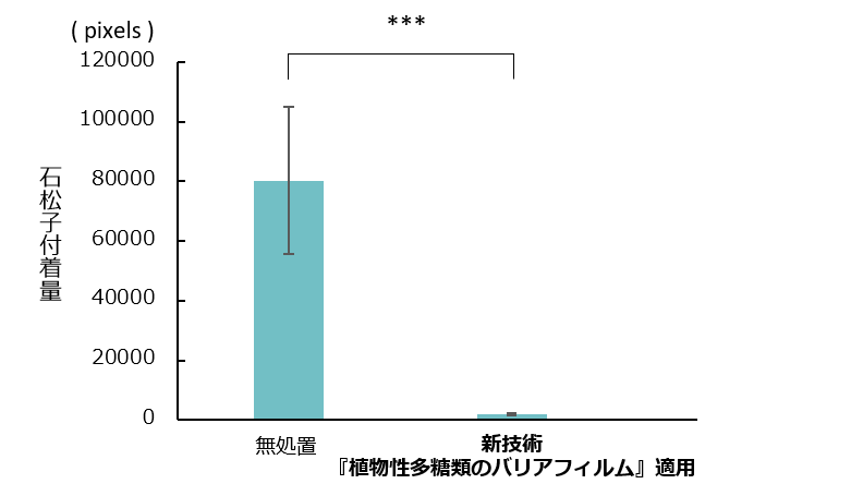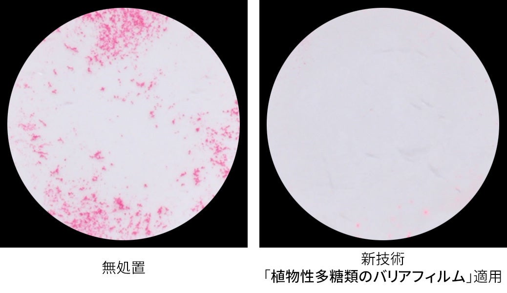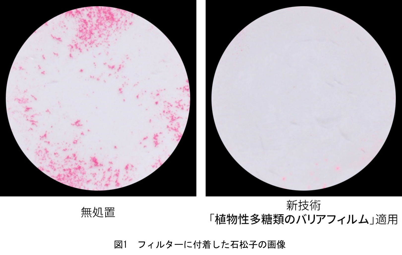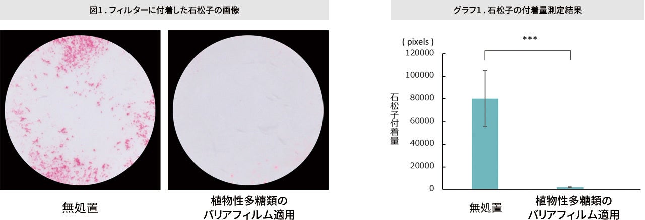 花粉の付着試験では、無処置のフィルターに花粉に近いとされる石松子が付着(図1左)、新技術の『植物性多糖類のバリアフィルム』を事前に施したフィルターには、石松子の付着がほぼ見られませんでした(図1右)。測定結果からは、『植物性多糖類のバリアフィルム』を適用すると、花粉の付着が97%抑制されることが分かりました(グラフ1)。