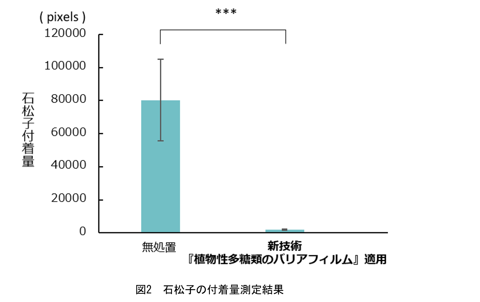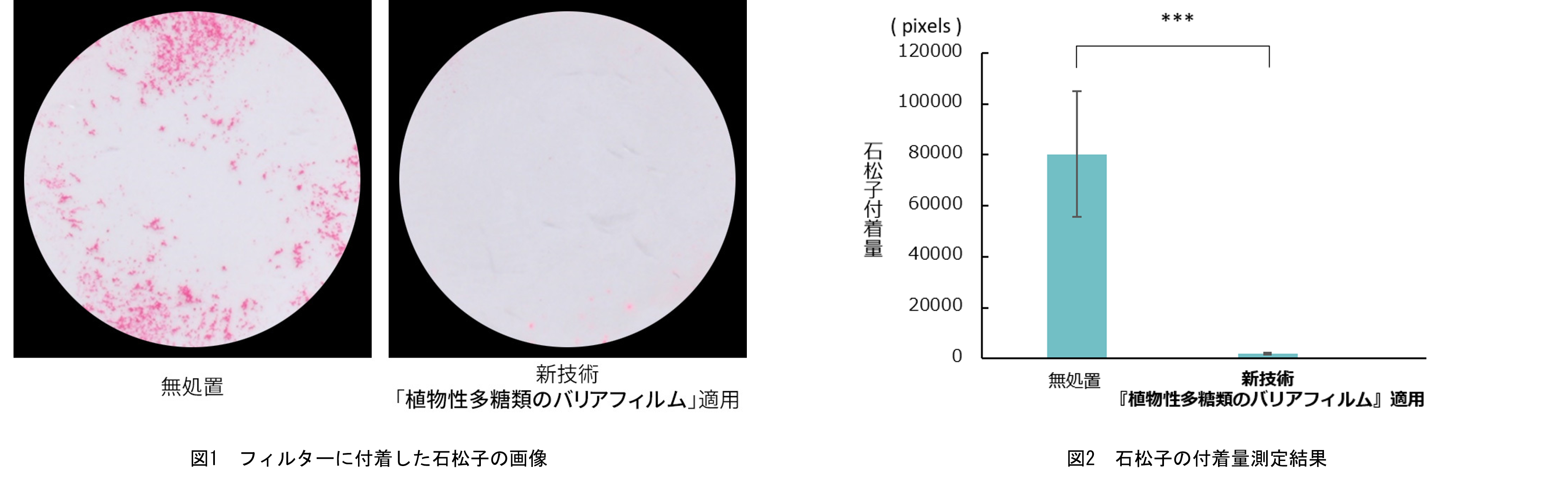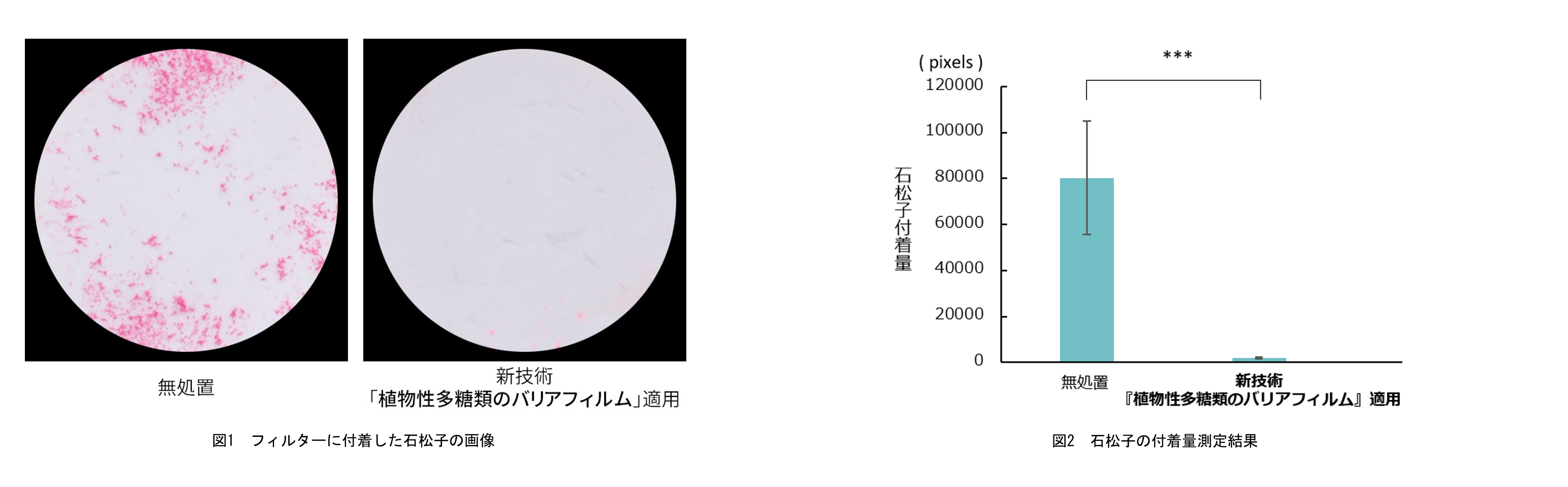花粉の付着試験では、無処置のフィルターに花粉に近いとされる石松子が付着(図1左)、新技術の『植物性多糖類のバリアフィルム』を事前に施したフィルターには、石松子の付着がほぼ見られませんでした(図1右)。測定結果からは、『植物性多糖類のバリアフィルム』を適用すると、花粉の付着が97%抑制されることが分かりました(グラフ1)。