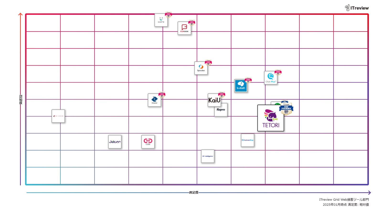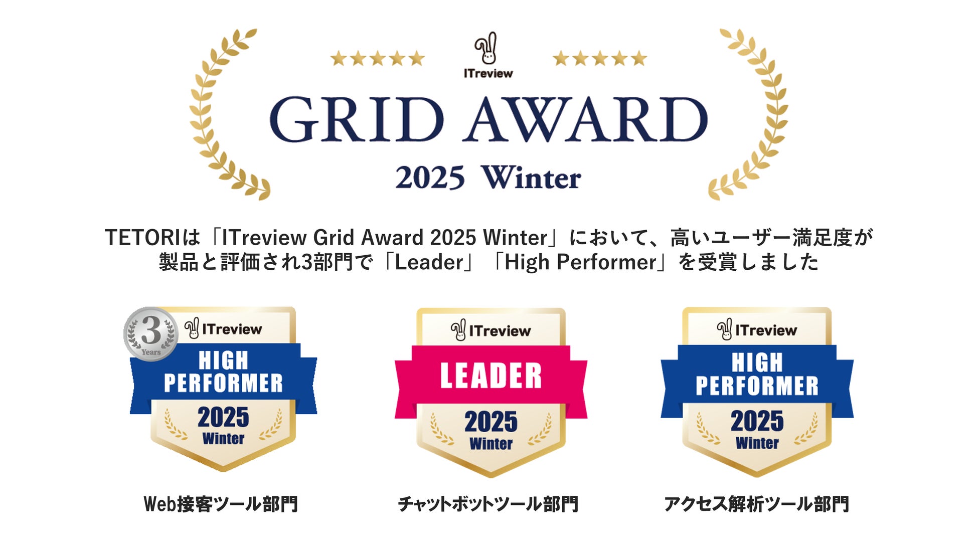 ITreview Grid Awardとは、法人向けのソフトウェア、クラウドサービスのレビュー(口コミ)プラットフォーム「ITreview」に投稿されたレビューをもとに、四半期に一度ユーザーに支持された製品が表彰される場になります。Web接客ツール「TETORI(テトリ)」は、「ITreview Grid Award 2025 Winter」の「Web接客ツール部門」「アクセス解析ツール部門」の2部門において「High Performer」、「チャットボットツール部門」において「Leader」の称号を受賞いたしました。今後もさらにお客様の満足度向上を目指してサービス開発に邁進してまいります。