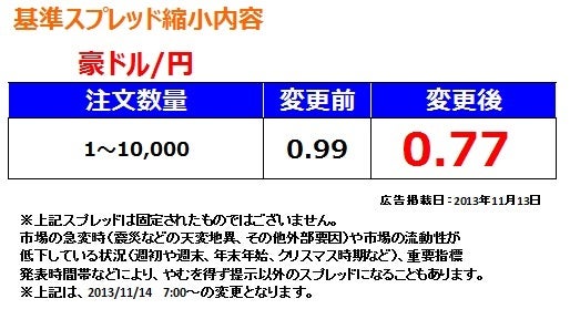 豪ドル/円基準スプレッド(2013年11月14日(木)午前7時から)