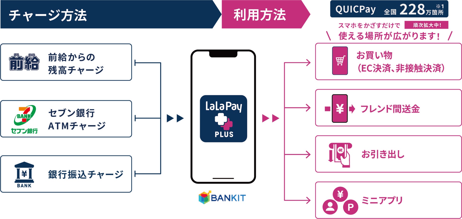 今般の合意にもとづき、きらぼしテックでは、今夏に『ララPayプラス』アプリの提供を予定しております。『ララPayプラス』アプリでは、BANKIT®の活用により、全国228万箇所以上※1の「QUICPay™(クイックペイ)」加盟店で非接触決済の利用が可能※2となり、現行の『ララQ』アプリと比較してより便利に「前給」サービスをご利用いただけます。さらに、ミニアプリ機能を通じて様々な機能をスピーディーに提供致します。