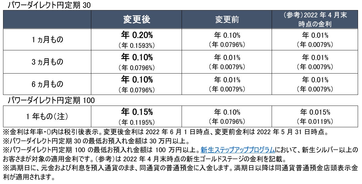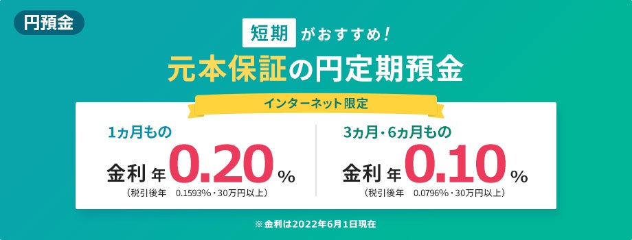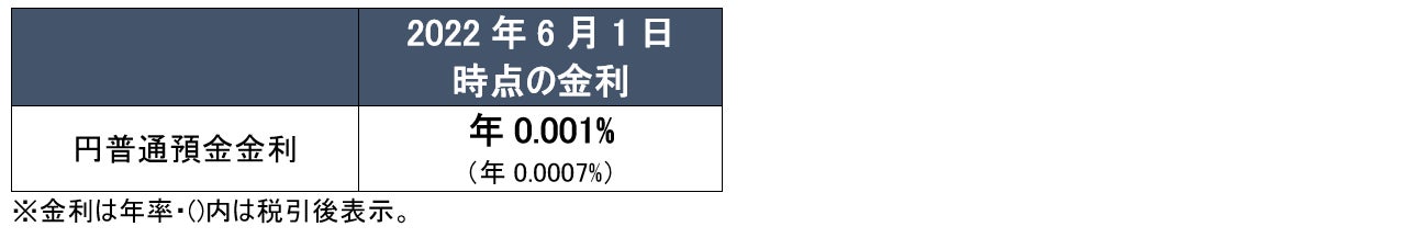 今般の引き上げにより、円定期預金は1ヵ月もので年0.20%(税引前)と変更前の2倍、2022年4月末時点の金利(年0.01%)からは20倍の水準となります。また外貨定期預金は、米ドル1年もので業界最高水準(*)となる年3.0%(税引前)の金利をご提供します。なお、新規に口座を開設するお客さまは、2022年5月に金利を引き上げた「スタートアップ円定期預金」にて、3カ月もの円定期預金を年1.0%(税引後金利年0.7968%)でご利用いただけます。