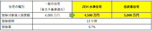 また、ZEH認証及び低炭素建築物の取得により、住宅ローン控除の借り入れ上限額の積み増しや登録免許税の税率引き下げの優遇が受けられます。 (下表参照 )