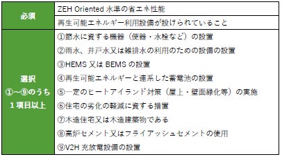 それに加え、新たに再生可能エネルギー設備の設置が要件化され、また節水に資する機器の設置等の任意選択項目を満たすことで、低炭素建築物の認定が取得できます。(下表参照)
