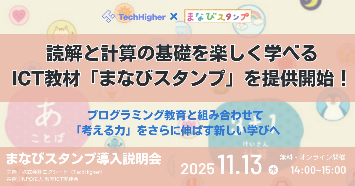 10代向けデジタル人材育成サービス『TechHigher』を運営する株式会社エクシード(本社:東京都渋谷区、代表取締役:澤部愛子)は、NPO法人教室ICT実践会が開発・提供する学習ドリル教材「まなびスタンプ」を2025年11月より提供開始します。