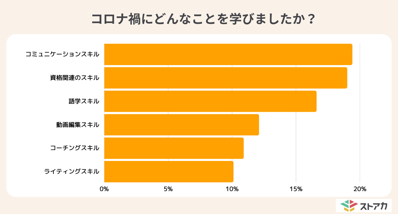 コロナ禍で学んだスキルの中で最も多かったのは「コミュニケーションスキル」であり、次に「資格関連のスキル」第3位は「語学スキル」という結果になりました。コロナ禍での学びにおいて、仕事に直結するスキルが高い関心を集めていたことを示しています。コミュニケーションスキルの重要性は、汎用性が高いスキルであり、オンラインでのコミュニケーションが増えたことによるものと考えられます。また、資格関連のスキルは、自己啓発やキャリアアップへの意欲が高いことを反映しています。