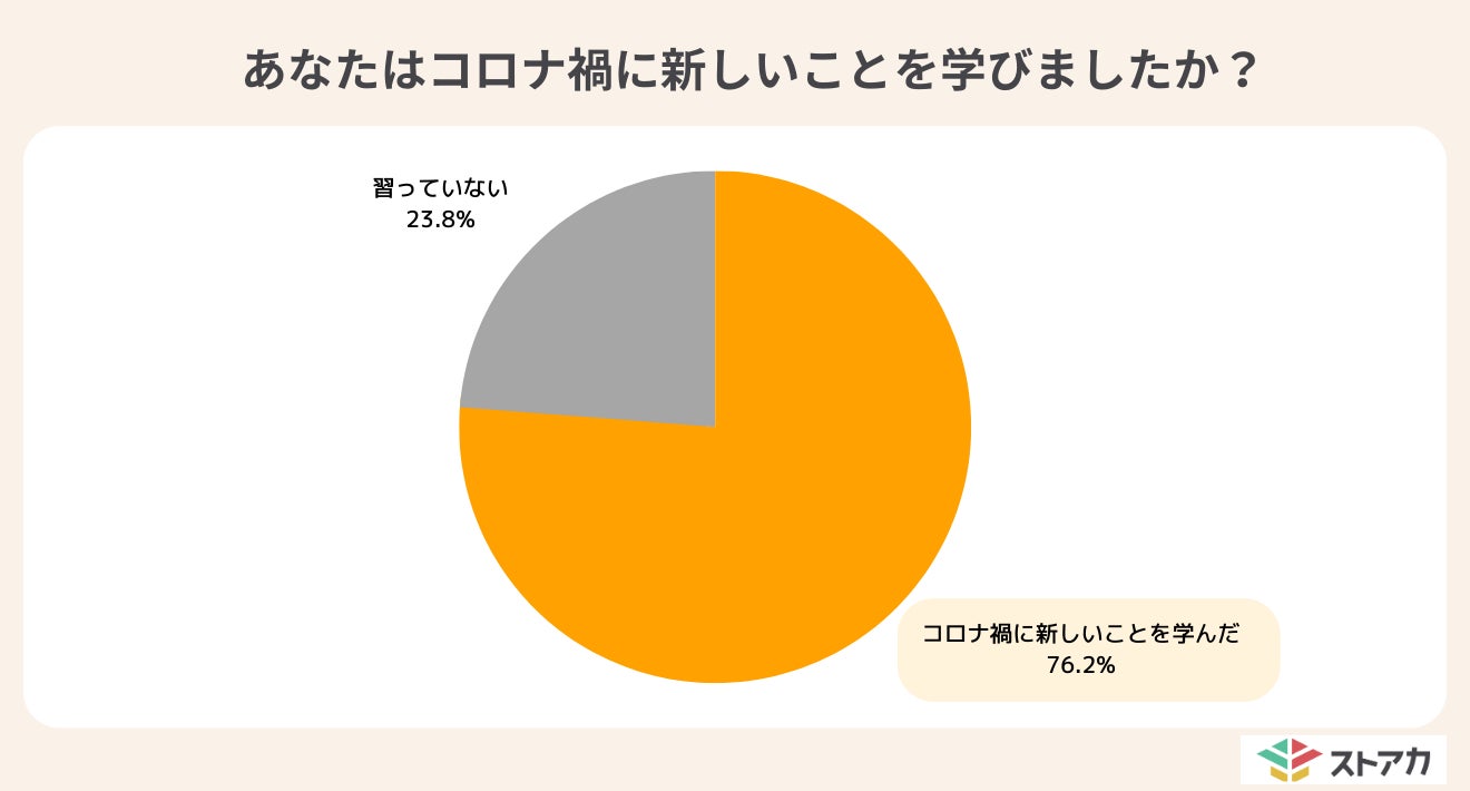 コロナ禍で新しいことを学んだ人の割合は全体の76%でした。さらに、「学んだことを仕事や副業に活かしていますか?」という質問に対しては、約半数の人が学んだスキルを実際の仕事や副業に活用していることが明らかになりました。