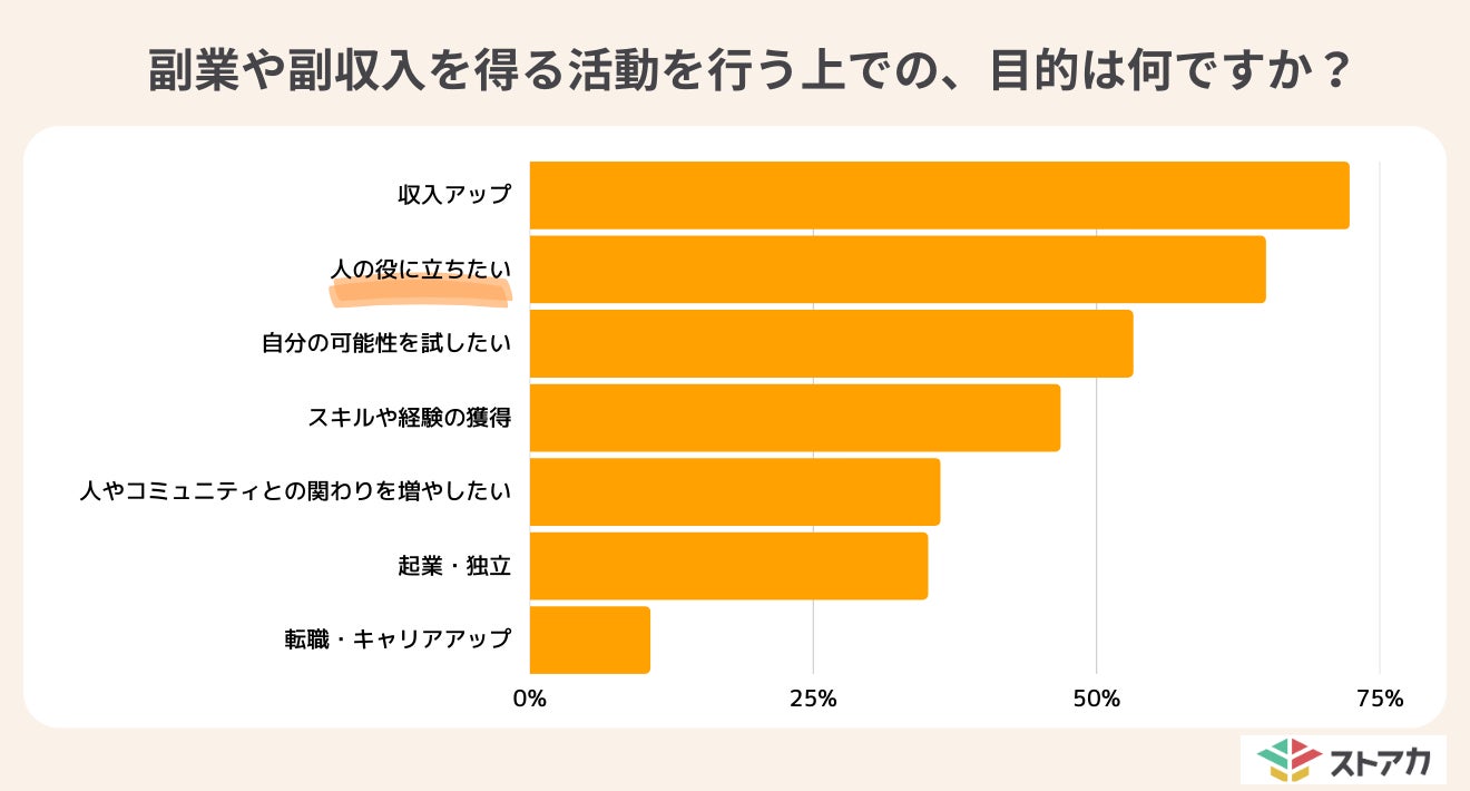 副業や副収入を得る活動において、目的について尋ねた結果、「収入アップ」(72%)が第1位でした。第2位の目的は「人の役に立ちたい」(64%)であり、収入アップに次ぐ高い割合をしめしました。昨年の調査では「人の役に立ちたい」と答えた方は46%だったことから、大幅に増加していることがわかります。