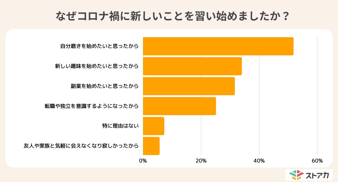 コロナ禍で新しいことを学んだ方に、その理由を尋ねた結果、第1位の回答は「自分磨きを始めたいと思ったから」でした。第2位は「新しい趣味を始めたいと思ったから」、そして第3位は「副業を始めたいと思ったから」という結果が得られました。これらの回答から、コロナ禍において社会が大きな変化を経験したことにより、多くの人々が自己成長に注力していたことがうかがえます。個人が自身のスキルや能力を向上させることによって、不確実性の高まる社会において、自らの可能性を広げようとしている様子が伺えます。また、副業への関心も高く、目的意識を持って学ぶ方が増えています。