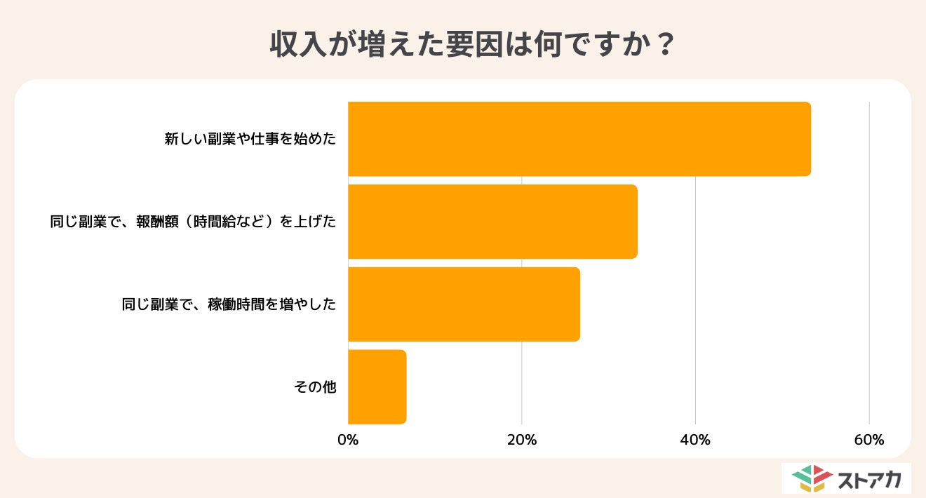 この結果から、全体的に副業による収入額が増加している傾向が伺えます。収入が増えた要因として「新しい副業や仕事を始めた」という回答が最も多く、次いで「同じ副業で報酬額を上げた」という結果になりました。