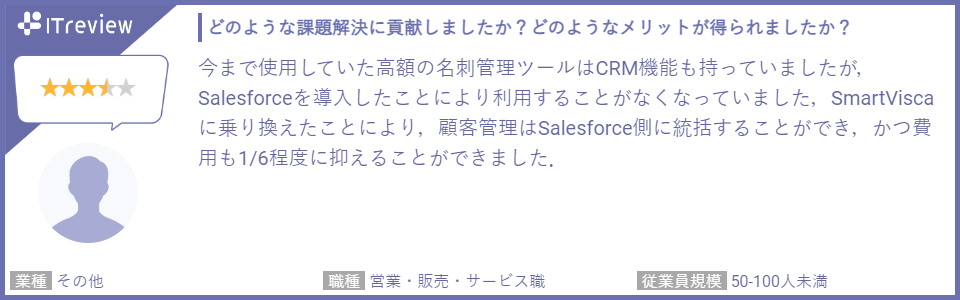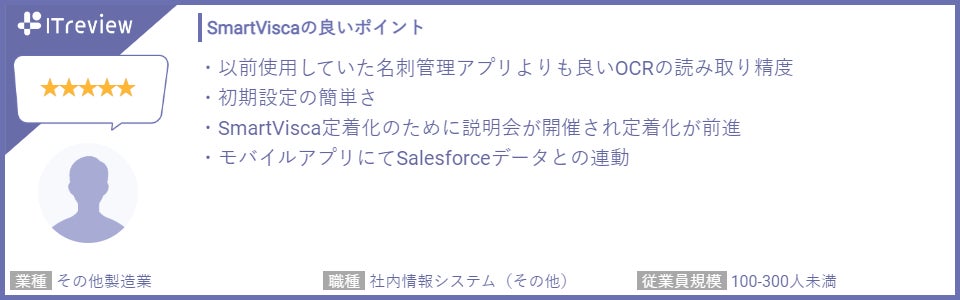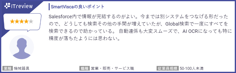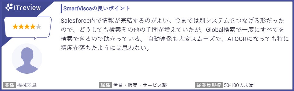 投稿されたレビューでは、スキャナーやスマートフォンで名刺を取り込み、デジタル化する過程で使用されるOCR(光学文字認識)の精度と速度に満足しているといった点や、他社名刺管理からSmartViscaに切り替えて名刺管理コストを大幅に削減できた点、さらにSalesforceとのデータ連携の効率の良さを高く評価する声を多くいただいております。