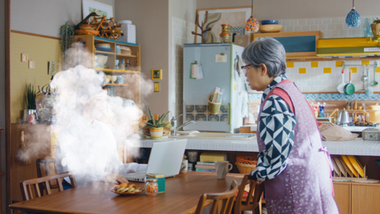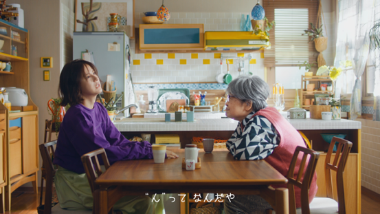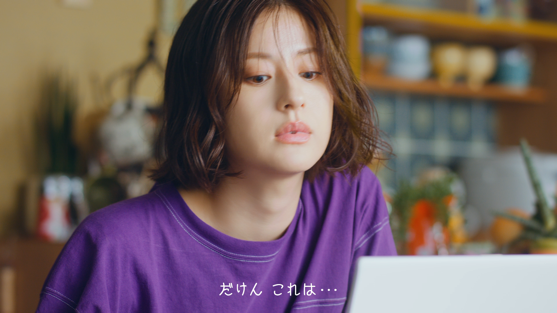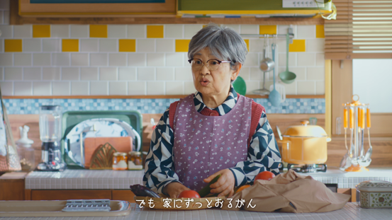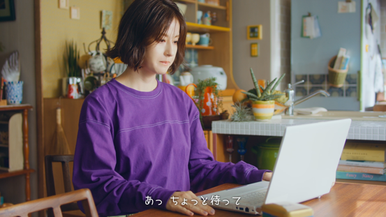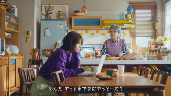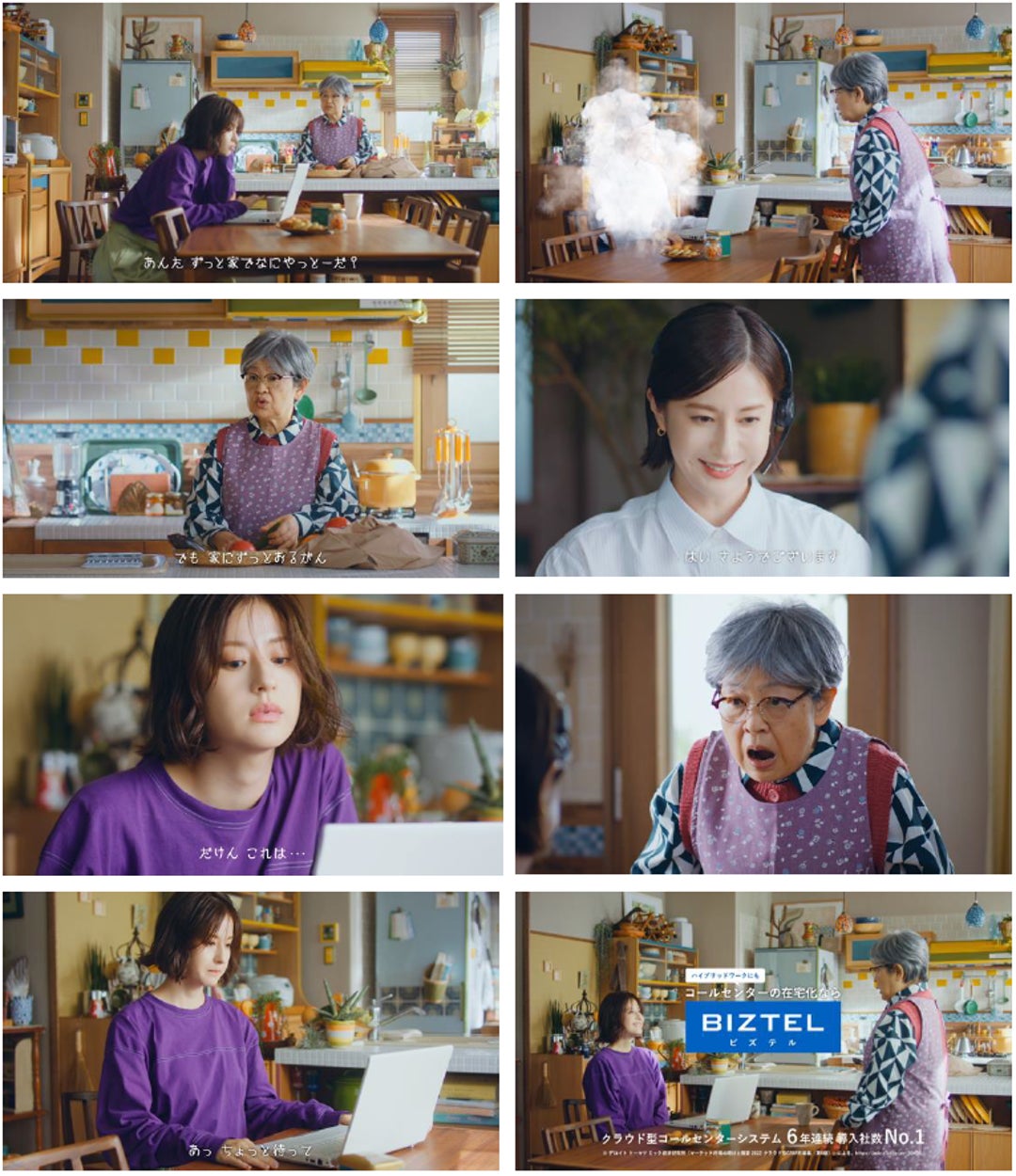 松本さん扮する女性が在宅勤務中に祖母と会話するシーンから始まります。米子弁(※2)での会話の途中、女性のパソコンから「BIZTEL」の着信音が鳴ります。すると、ラフな格好をしていたはずの女性が突然、きっちりとしたオフィススタイルに変身し、標準語を用いてオペレーター業務を開始します。通話を終え、元の姿に戻り一息つく女性。突然の変化に驚きを隠せない祖母にやさしい微笑みを返します。