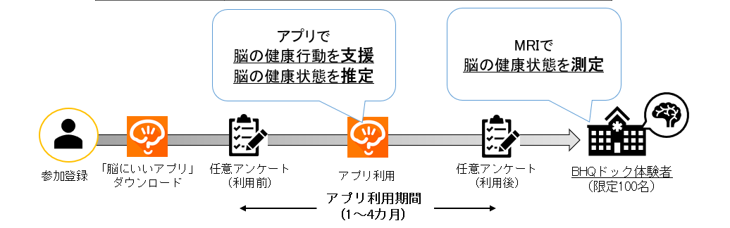 実施内容:ライフスタイルや健康意識に関するアンケートと、脳にいいアプリにて健康管理記録・推定BHQの測定(期間中継続して利用)を行っていただきます。