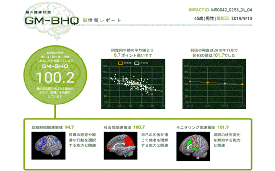 BHQドックでは、MRIによって脳を撮像した結果を分析し、分析後にBHQレポートをお渡しいたします。BHQレポートによって、同年代の平均数値と比較した「脳の健康状態」や、継続的に数値を計測することで「脳の健康状態」の経年推移が分かります。