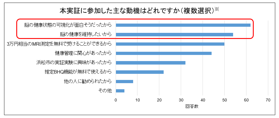 実証参加者に実証参加の動機について尋ねたところ、参加した主な動機として「脳の健康状態の可視化が面白そうだったから」や「脳の健康を維持したいから」といった動機での参加が多かった結果であることがわかりました。