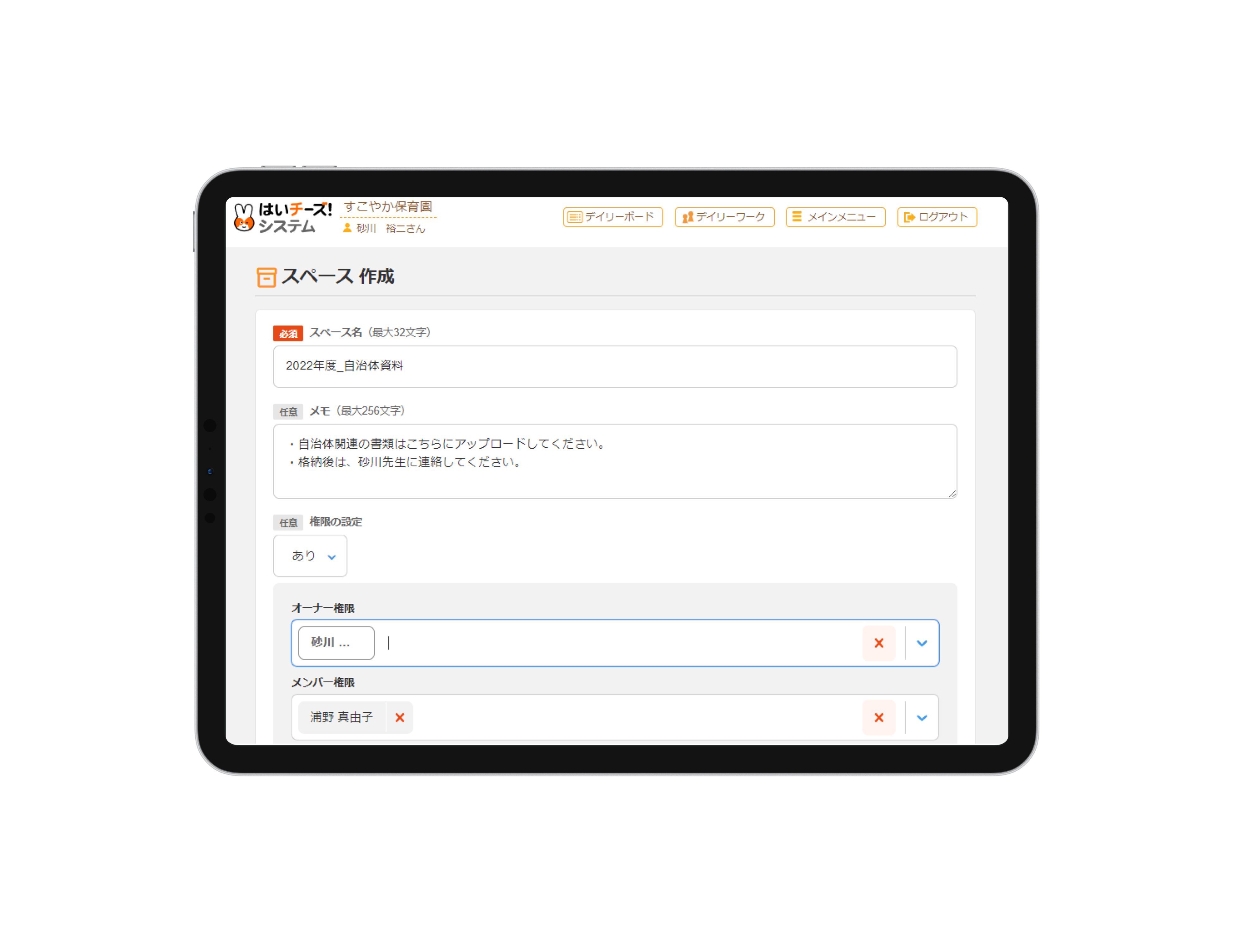 ファイル格納機能は、Excel、PDF、JPGなど施設で管理しているデータやファイルを「自治体資料」「入園式資料」「職員情報」など、項目ごとの格納スペースを作成し保管することができます。また、利用ユーザーごとに権限設定が可能です。これにより、全従業員や保育士のみなどファイルごとに閲覧権限の設定が行なえます。