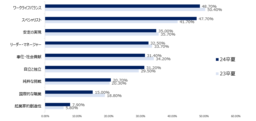 キャリアにおいて重視する項目についての調査 (※2) では、昨年同時期に実施した同様の調査結果において「スペシャリスト」の項目が2位に上昇して以来、更にその選択者の割合が増えています。(23卒夏の調査では41.7%、24卒夏の調査では47.7%)