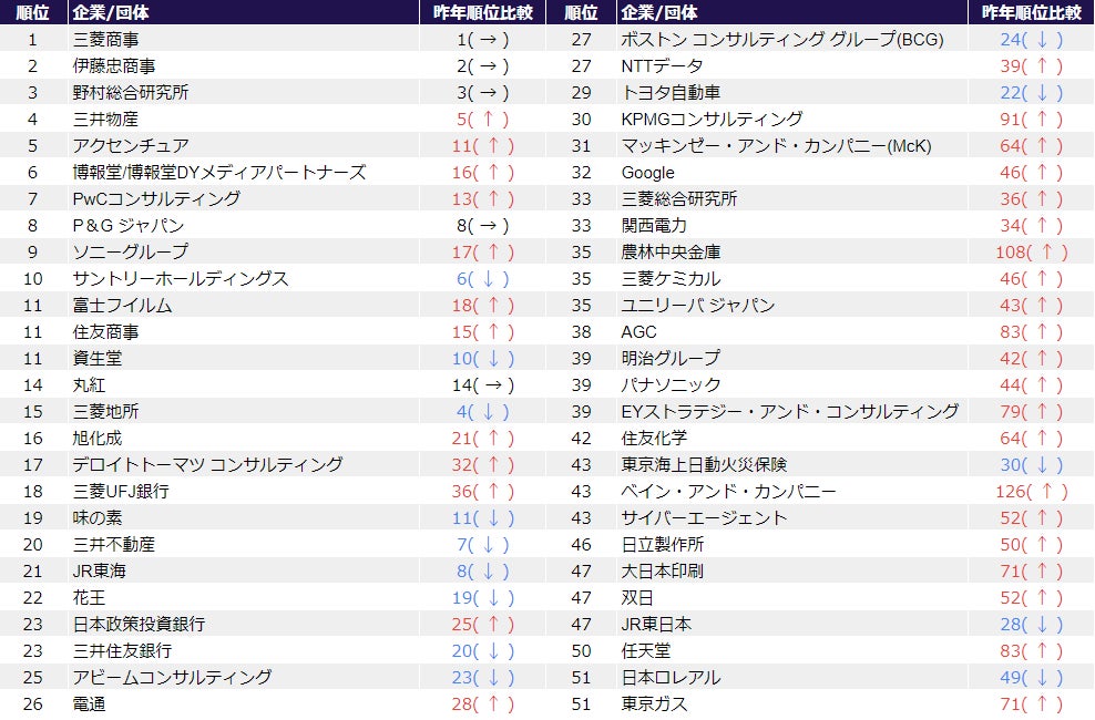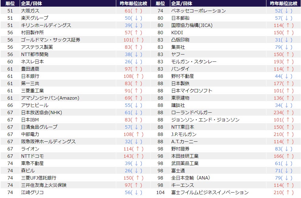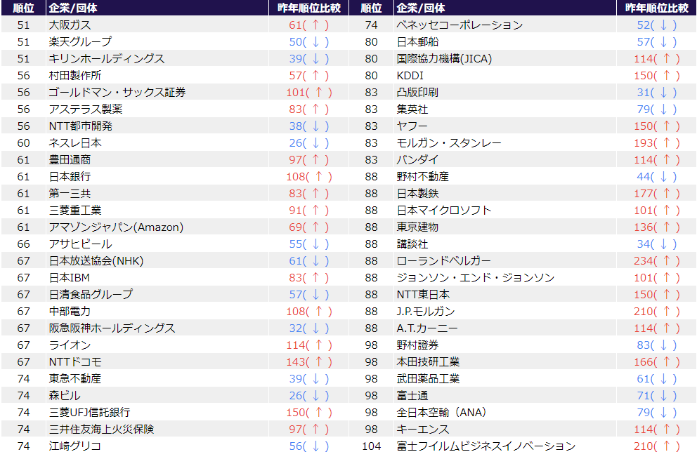 ・コンサル/通信/IT業界は昨年来からの傾向が継続し、順位上昇。例えば、PwCコンサルティング(13位→7位)、Google(46位→32位)、ヤフー(150位→83位)、NTT東日本(150位→88位)など。デジタル化の流れの中での社会的注目の高まり、報酬・待遇・勤務地等の制度面での柔軟性ある制度をとっている会社が多いこと、などが要因として考えられます。