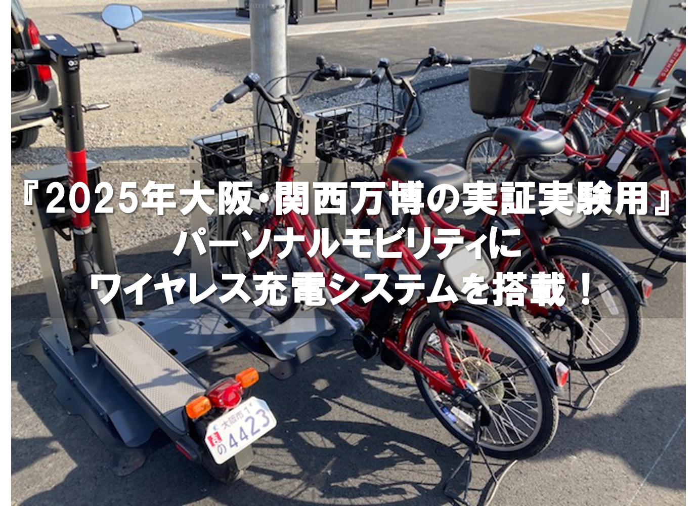 万博開催の機運醸成と未来社会を見据えたイノベーション創出に向けた「夢洲における実証実験」において、パーソナルモビリティの新たな充電手法として、㈱ビー・アンド・プラス製のワイヤレス充電システムが塔載されました。今回は電動自転車とキックボードの2つの車両を共用で充電できるハイブリットスタンドを設置しています。