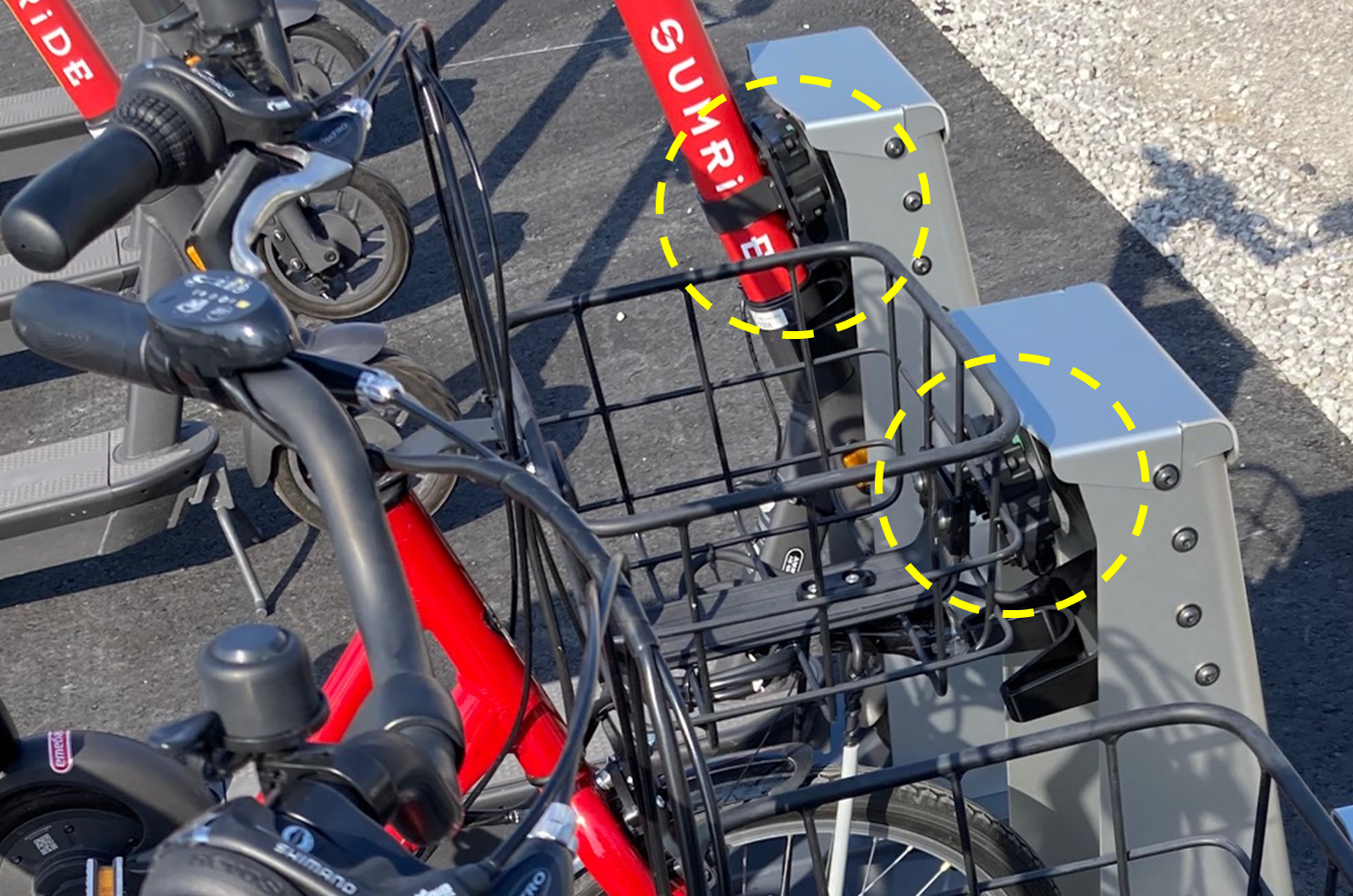 今回は、キックボードと電動自転車の充電スタンドを共通化することで、どちらの車両でもスムーズに停車できるようにしています。