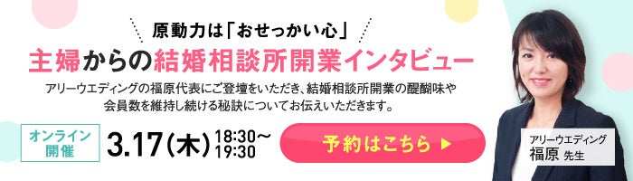 【3月17日開催】結婚相談所開業・副業を検討の方向けオンラインセミナー!『原動力はおせっかい心!主婦からの結婚相談所開業をインタビュー』
