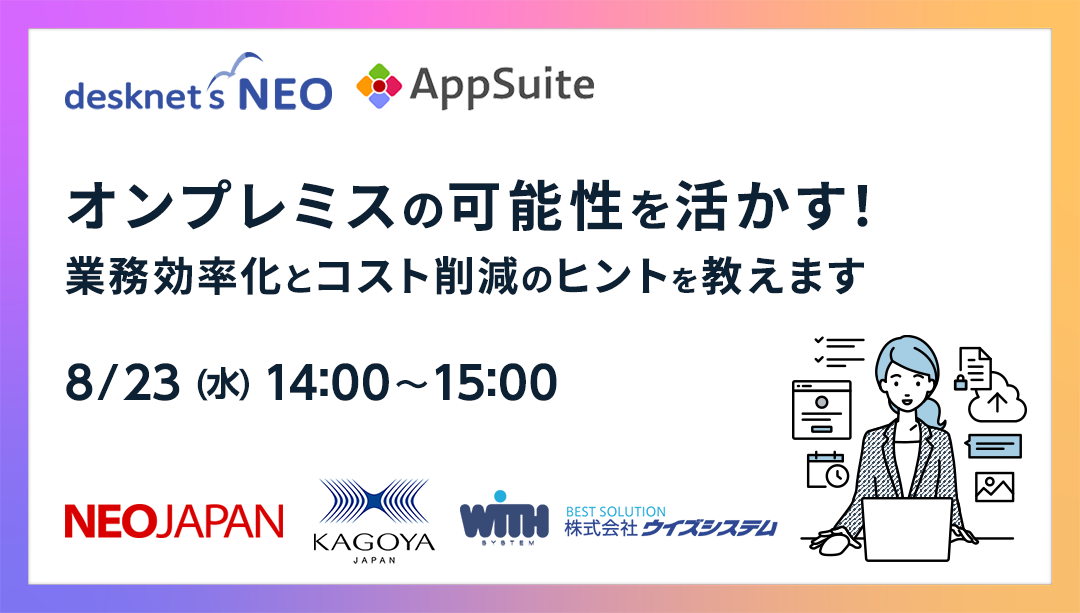 カゴヤ・ジャパン株式会社(本社:京都府京都市、代表取締役社長:岡村 武)は、2023年8月23日(水)株式会社ネオジャパン主催、 desknet'sNEO オンラインセミナー『オンプレミスの可能性を活かす!業務効率化とコスト削減のヒントを教えます』へ登壇します。