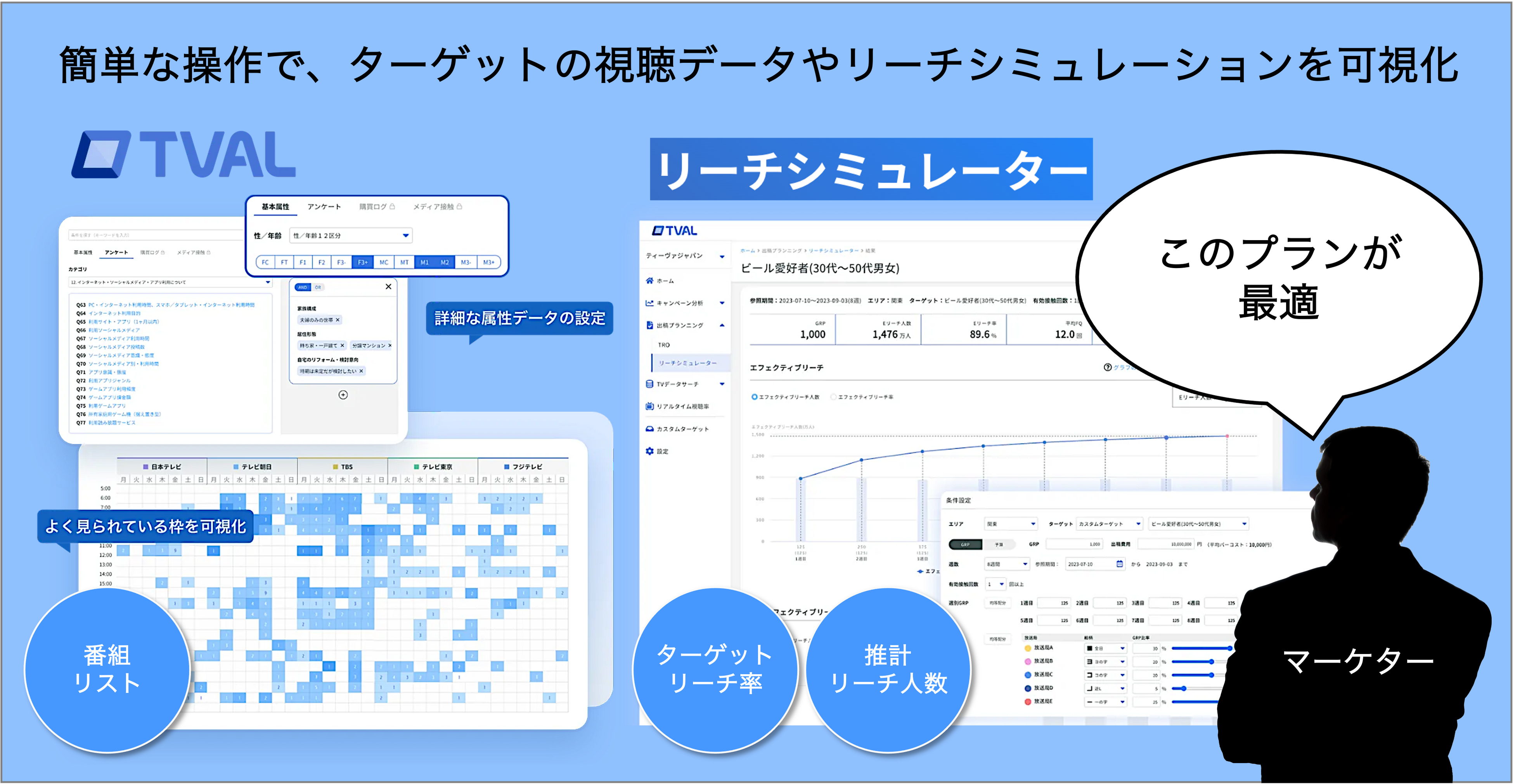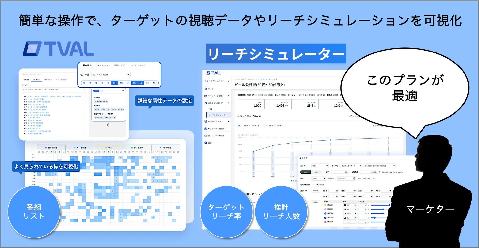 本サービスのリーチ予測は、国内最大規模の24,000人以上のテレビ視聴モニターから取得した視聴データを保有する「TVAL(ティーバル)」※のデータを活用し、ターゲットがよく観ているテレビ番組を可視化します。