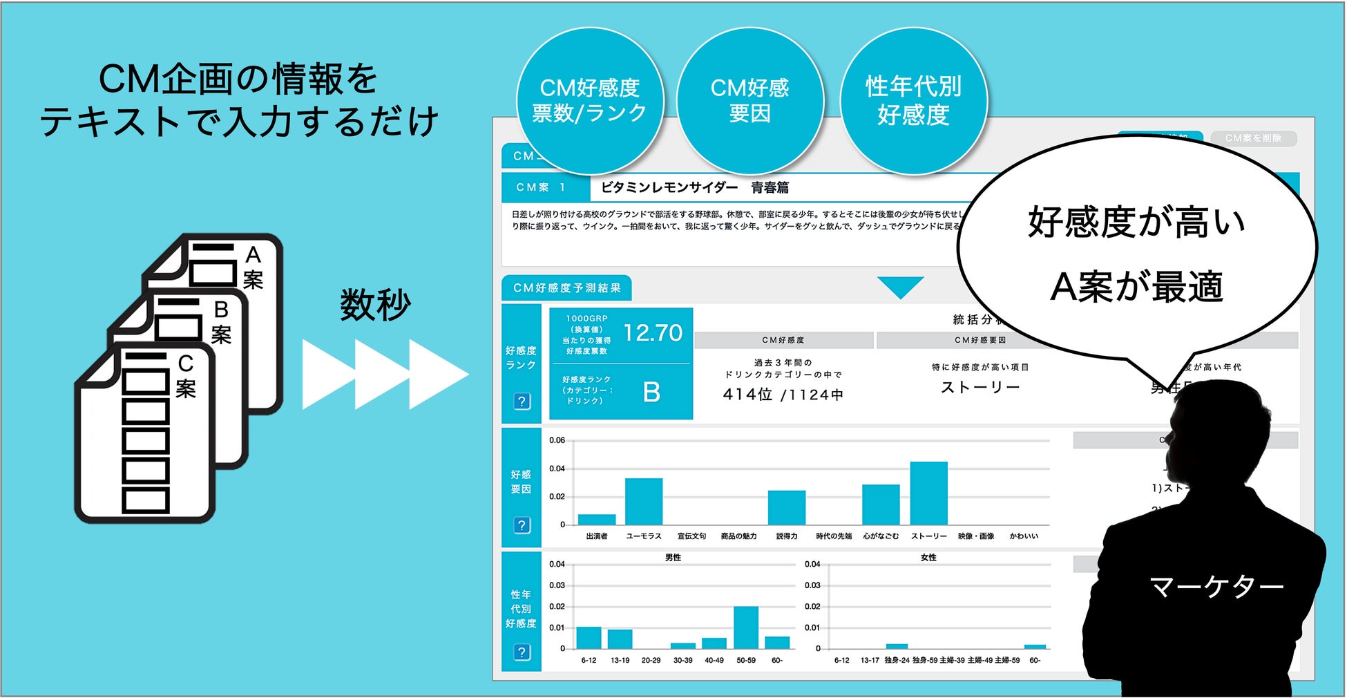 CM好感度予測AIは、CM総合研究所が保有するテレビCMデータとCM好感度データをインプットし構築されたシステムです。絵コンテや字コンテなどのCM企画の情報をテキスト入力するだけで、①CM好感度票数/ランク②好感要因③性年代別好感度の予測結果を直感的なダッシュボードで表示。