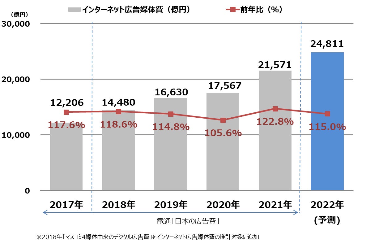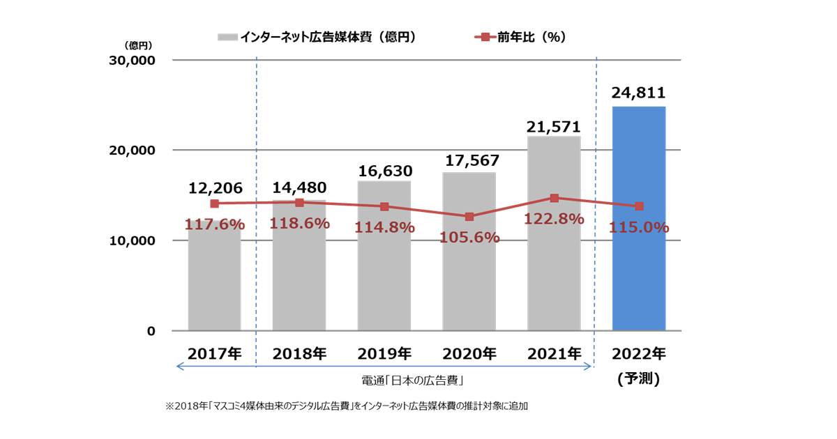 ~2022年のインターネット広告媒体費は総額で2兆4,811億円(前年比115.0%)になると予測~