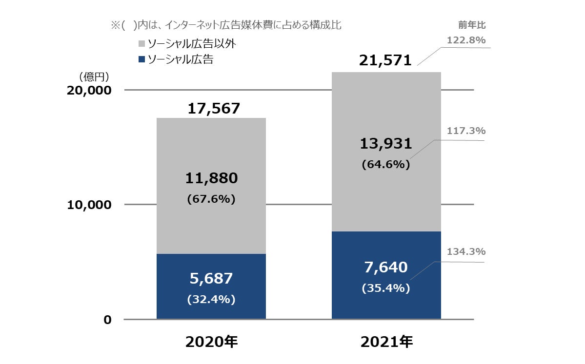 ソーシャルメディアのサービス上で展開されるソーシャル広告は前年比134.3%の7,640億円と大きく伸長し、インターネット広告媒体費全体の35.4%となった。【グラフ6】