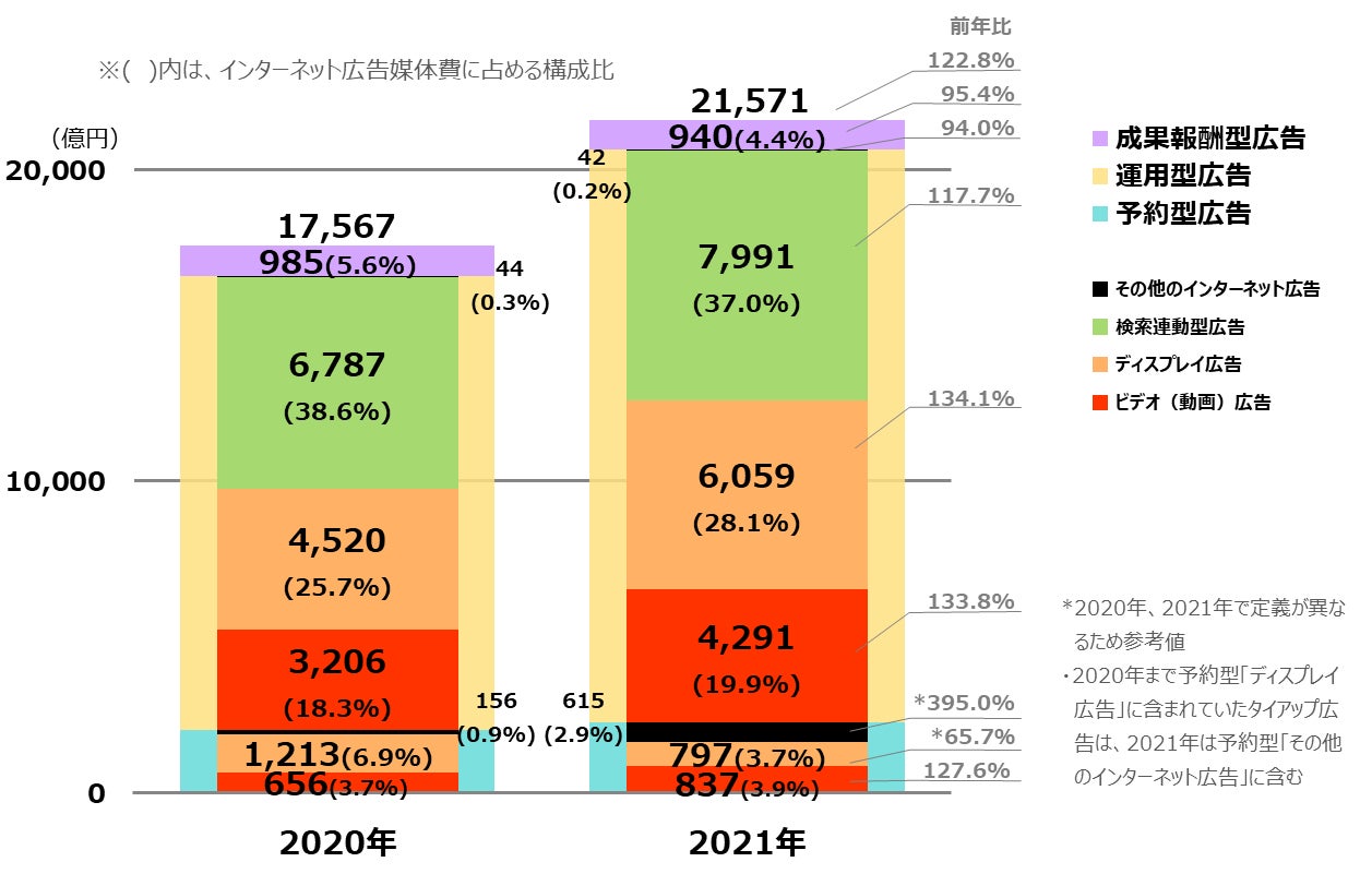 2021年のインターネット広告媒体費は、2兆 1,571 億円(電通「2021年 日本の広告費」より)。そのうち構成比が高いのは検索連動型広告(37.0%)とディスプレイ広告(31.8%)で、あわせて約7割を占める。ビデオ(動画)広告は前年比132.8%の5,128億円と大きく伸長し、初めて5,000億円を突破した。なお、2020年までディスプレイ広告に含まれていたタイアップ広告を、2021年ではその他のインターネット広告に含むことに定義変更した。2021年のタイアップ広告はおよそ300~350億円規模と推計。【グラフ1】