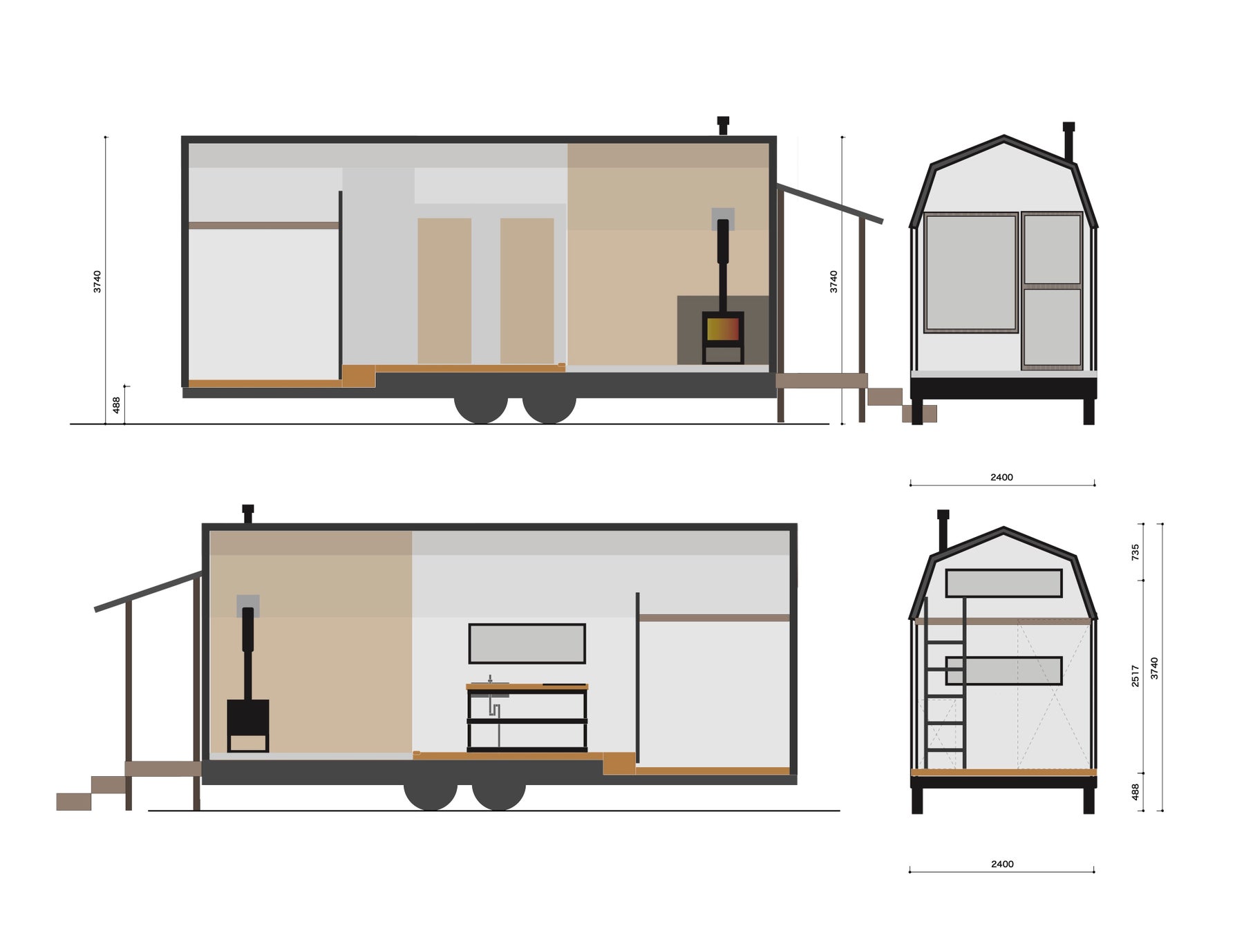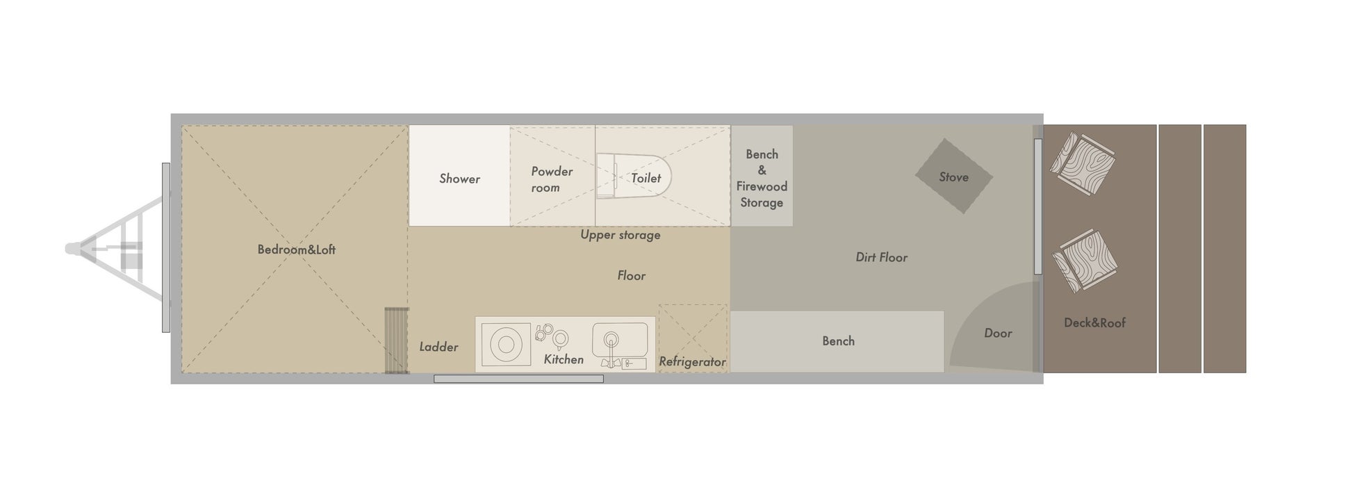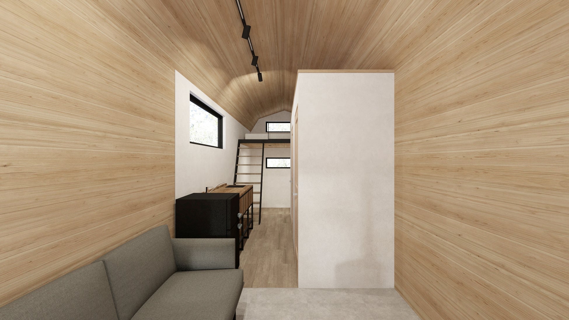 内部にはキッチン・トイレ・パウダールーム・シャワールームなどの水回りを完備し、キッチンの奥にはベッドルーム、ストレージとしても2段ベッドとしても使えるロフトを配置。