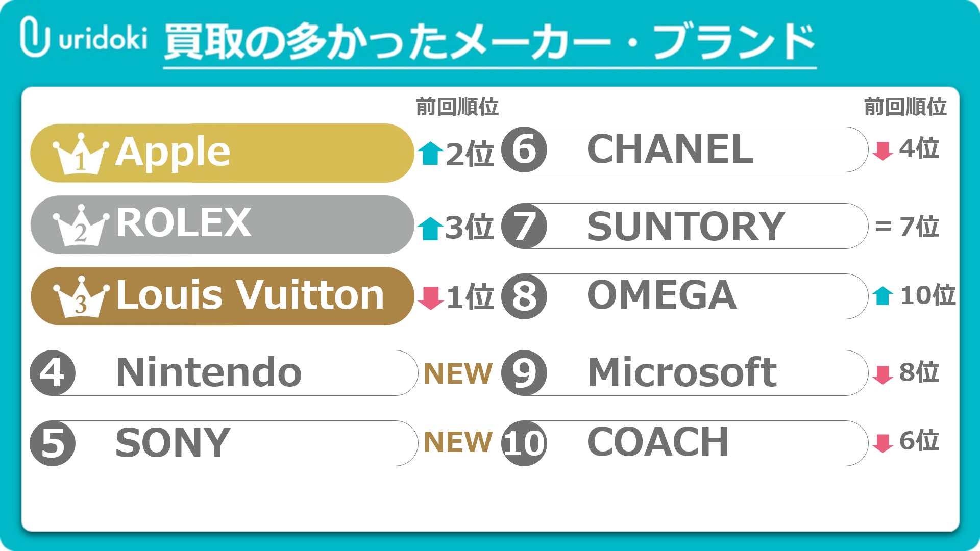 買取依頼の多かったメーカー・ブランドの1位はApple。2022年上半期から順位を1つ上げて1位になりました。2位にはロレックス、3位にルイ・ヴィトンがランクイン。そのほか、シャネル、オメガ、コーチなどが上位を占めています。