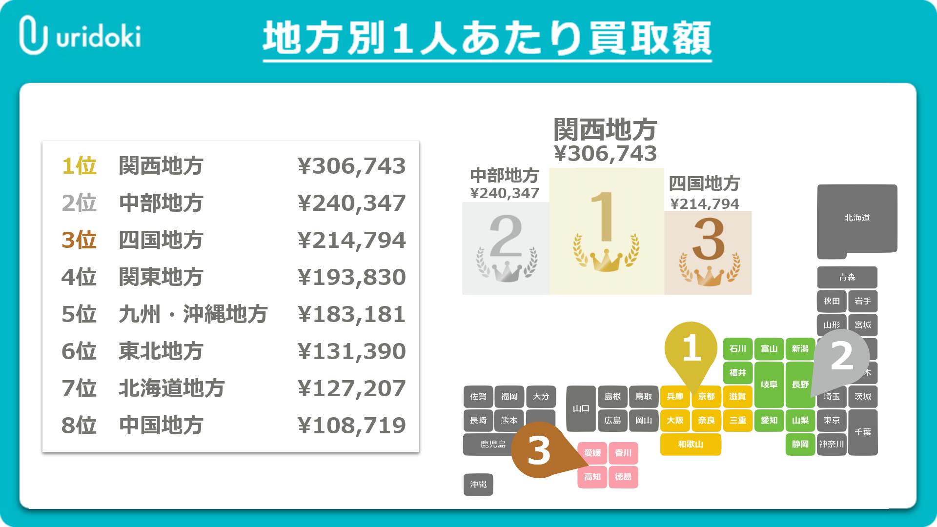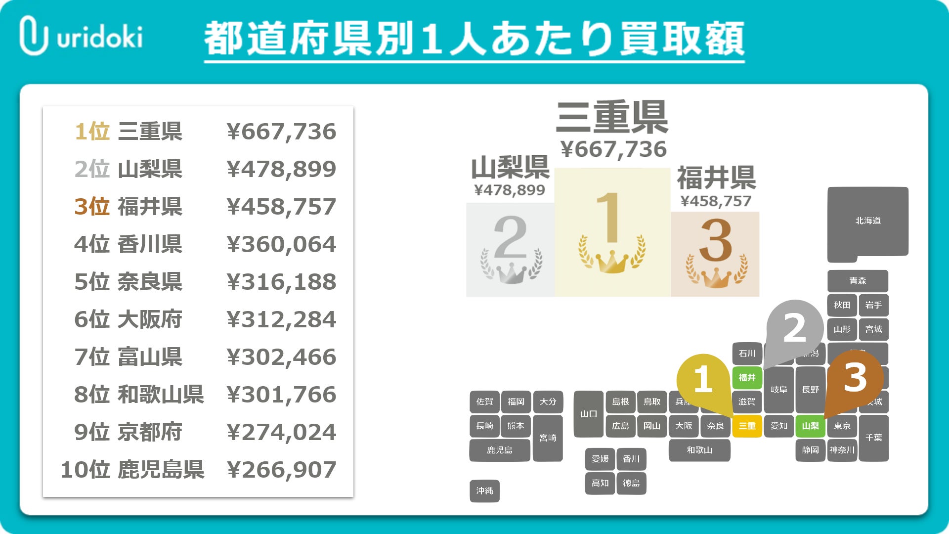 すべての都道府県別1人あたり買取額は、サイト内(https://uridoki.net/pr/kiji_244368/)にてご覧いただけます。