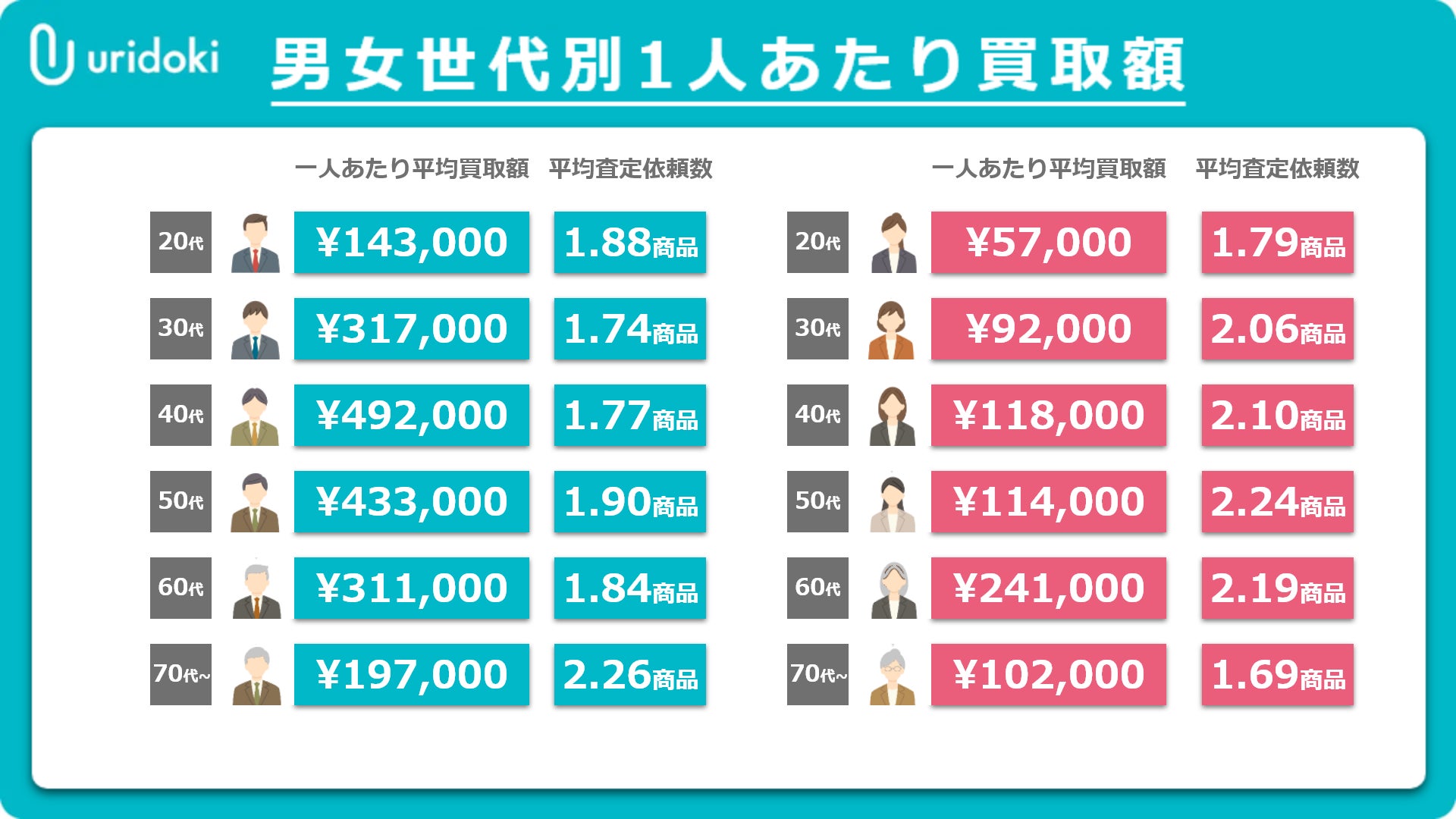■ 男女別の買取金額は40代男性がもっとも高く、1人当たり49.1万円