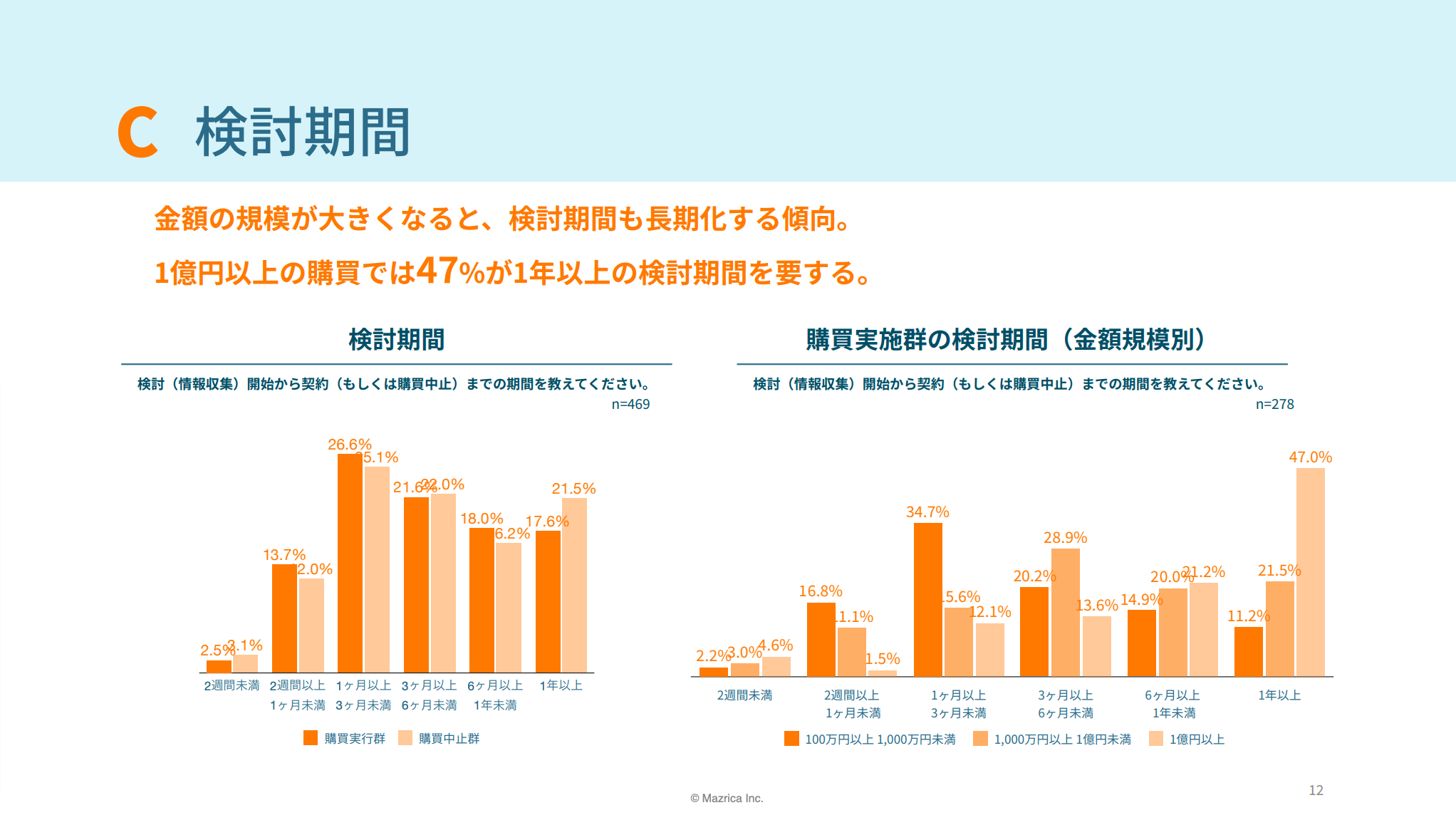 購買金額が大きくなるにつれて、検討期間も長期化する傾向が見られた。