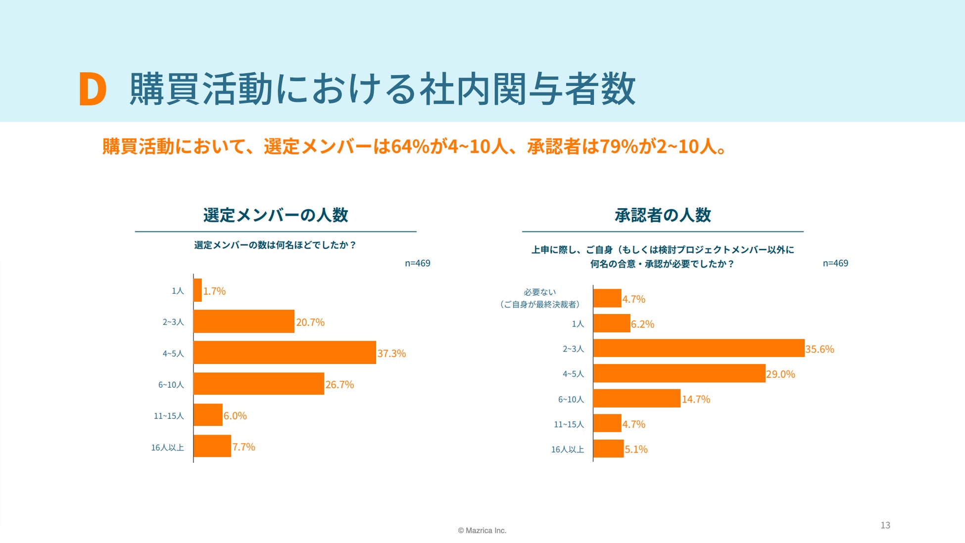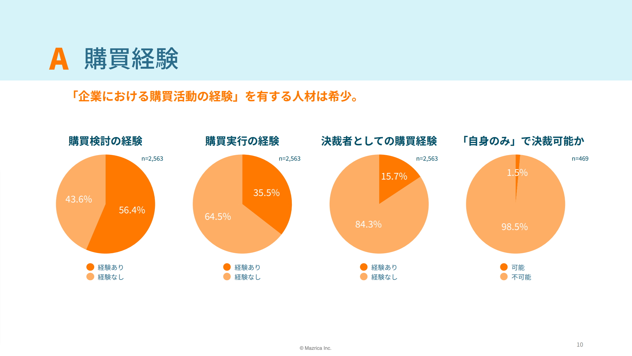 購買検討の経験、購買実行の経験、決済者としての購買経験、「自身のみ」で決済可能か、この4つの設問に対する回答結果から、購買活動に関わる人材はマイノリティであることが明らかとなった。