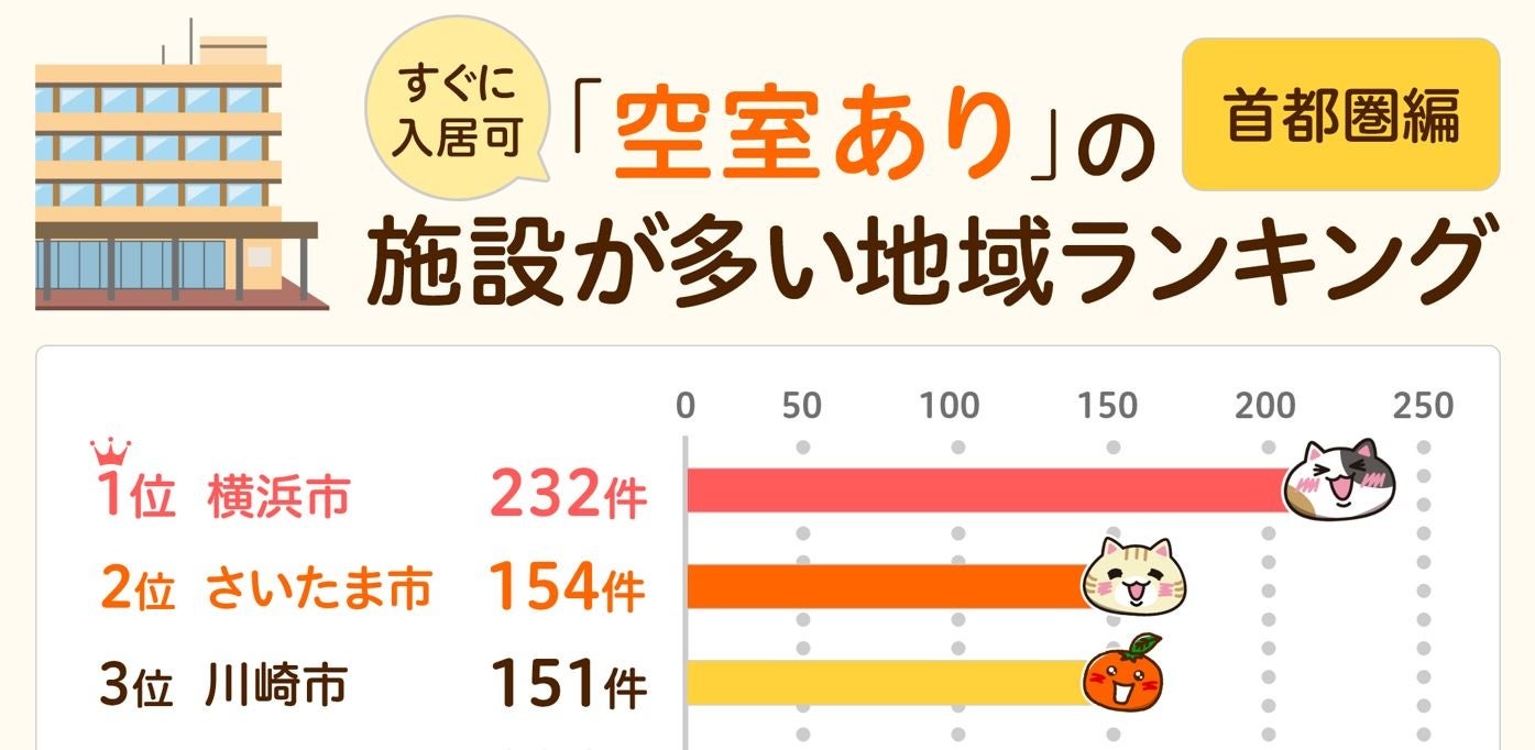 【みんなの介護】今すぐ入居できる!「空室あり」の老人ホームが多い地域ランキング 【2022年9月・首都圏編】