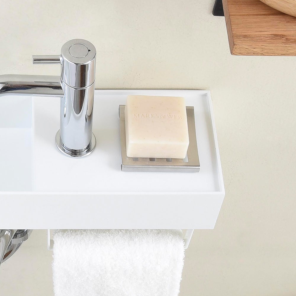 石鹸やアルコールディスペンサーなどが置ける広さがあり、エッジが5mm立ち上がっているため、床に水がこぼれにくくなっています。