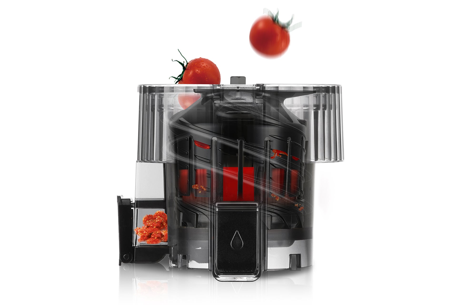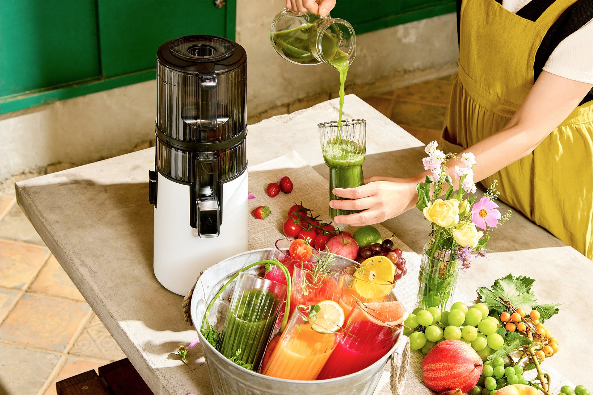 材料の準備過程を減らし、より便利に。カットしていない材料を一気に入れても自動でカットし搾汁します。メガホッパーに材料を詰めてスイッチを押すだけで、健康的なジュースの完成です。