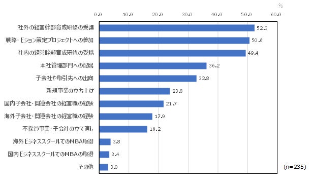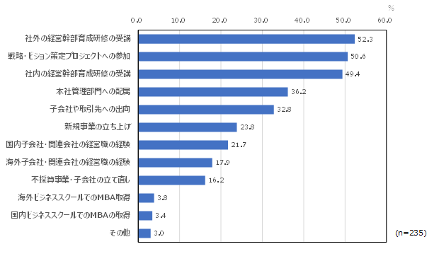 ○ また、上記設問で「まったく受けていない」と回答した人以外に、これまでに受けたことのあるトレーニング機会を尋ねたところ、第1位は「社外の経営幹部育成研修の受講」(52.3%)、第2位は「戦略・ビジョン策定プロジェクトへの参加」(50.6%)、第3位は「社内の経営幹部育成研修の受講」(49.4%)となりました。
