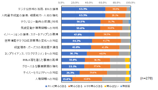 ○ また、経営戦略への影響が想定される項目として、デジタル技術の活用やデジタル・トランスフォーメーション(DX)、あるいは人的資本経営の推進、テクノロジーの動向と把握といったことについて、大きな関心が示されていることも興味深い結果です。