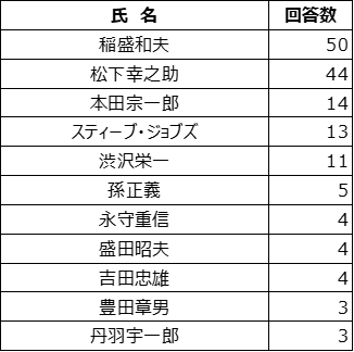 - 5.卓越した経営者であると思われる人物:第1位 稲盛和夫氏、第2位 松下幸之助氏、第3位 本田宗一郎氏、第4位 スティーブ・ジョブズ氏、第5位 渋沢栄一氏