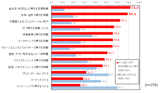 - もっと身につけておけば良かったと思う知識やスキルの第1位は「会社法・税法などに関する法律知識」、第2位は「財務・会計に関する知識」。
