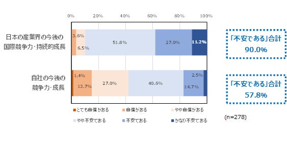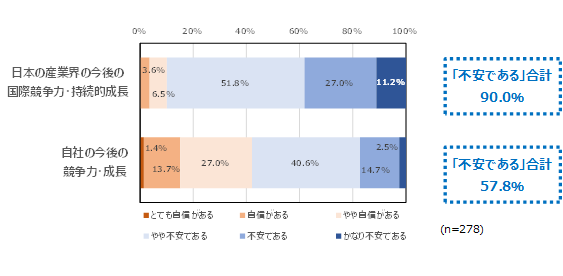 ○ また、日本の産業界の今後の国際競争力・持続的成長、ならびに、自社の今後の競争力・成長に対する評価を尋ねたところ、日本の産業界の今後の国際競争力・持続的成長については、「不安である」の合計(「やや」~「かなり」)が9割に達しました。自社の今後の競争力・成長についても、「不安である」の合計が5割を上回っています。【図4-②】